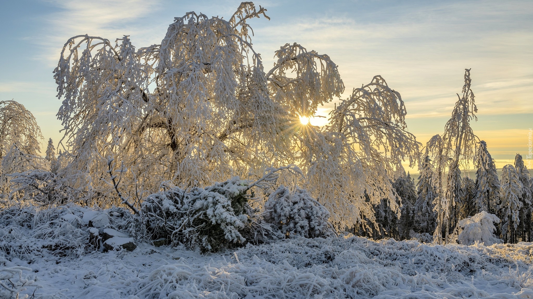 Edytor tapety: Ośnieżone drzewa i krzewy w promieniach słońca