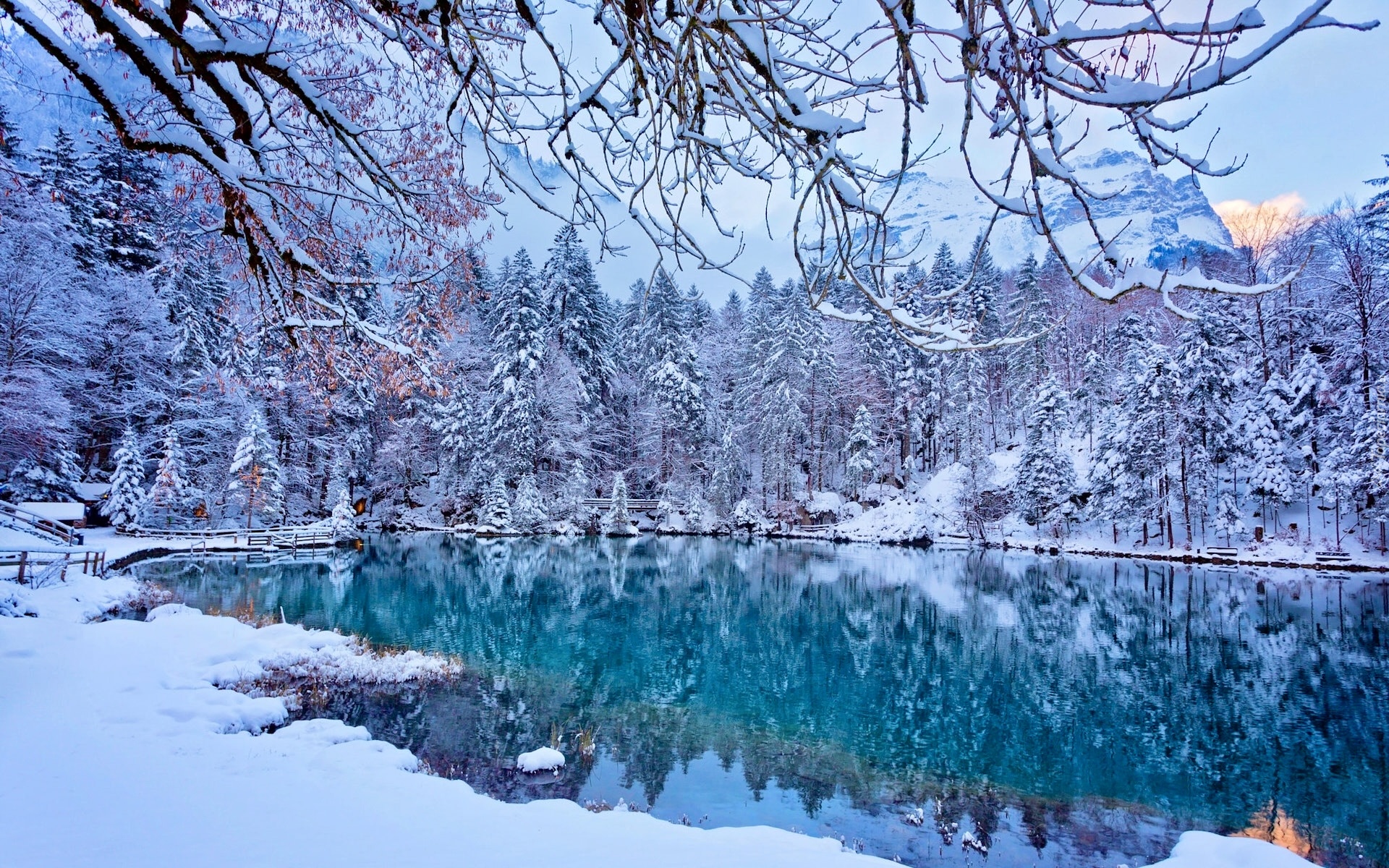 Edytor tapety: Ośnieżone drzewa nad górskim jeziorem Blausee w Szwajcarii