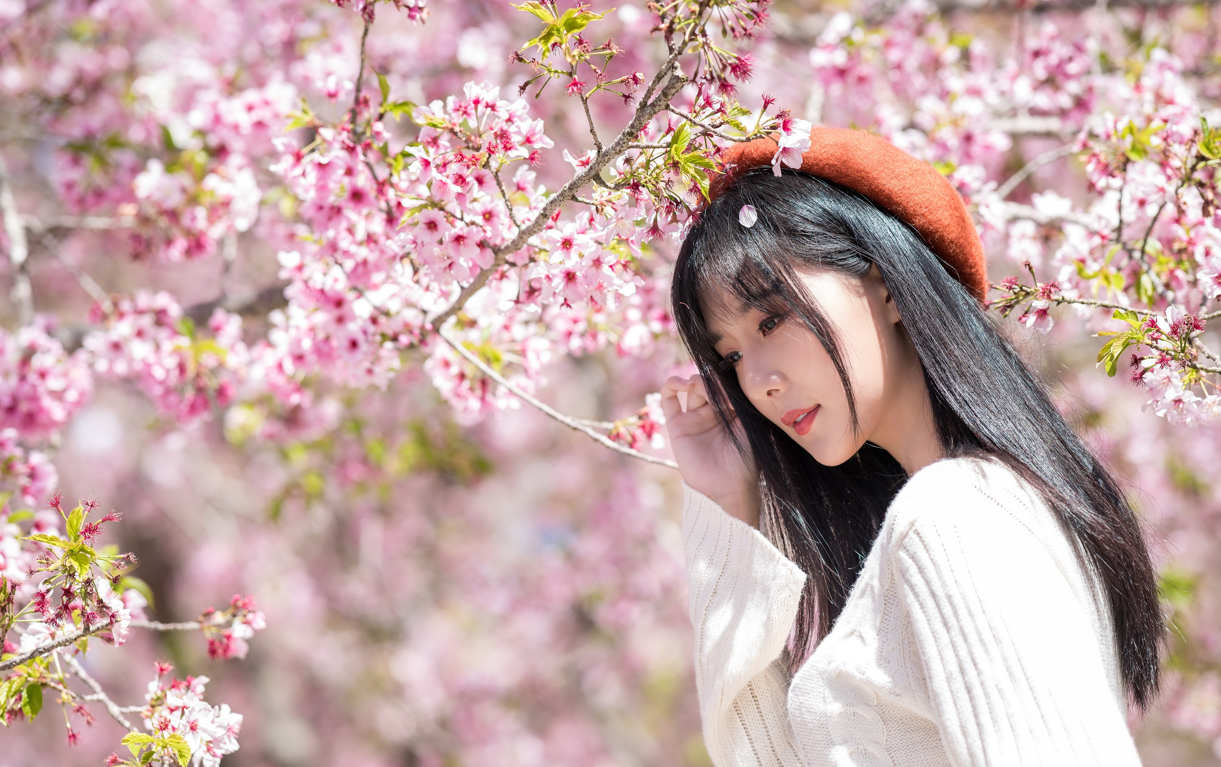Edytor tapety: Azjatka w berecie wśród kwitnących drzew