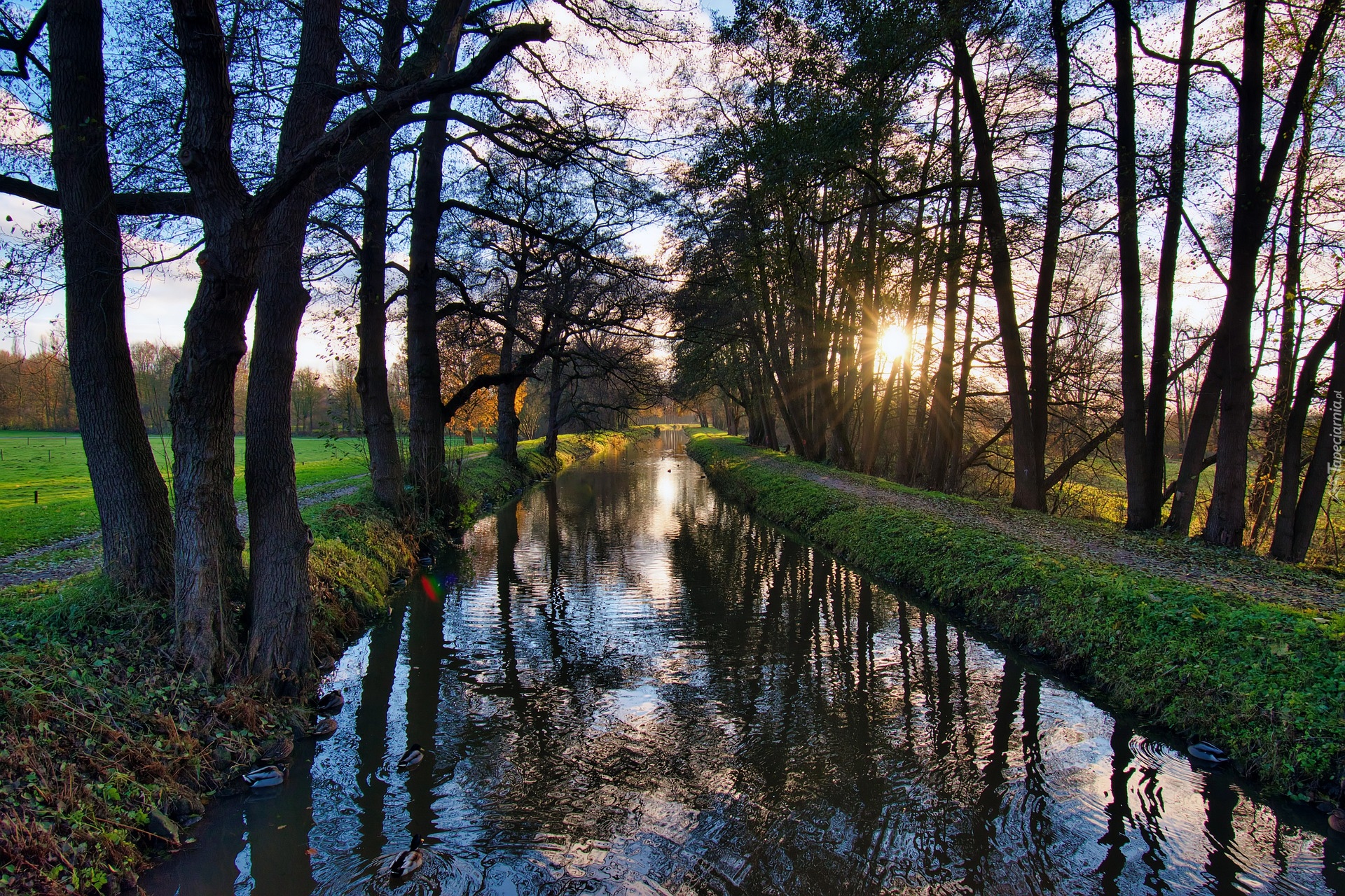 Edytor tapety: Zachodzące słońce za drzewami nad rzeką