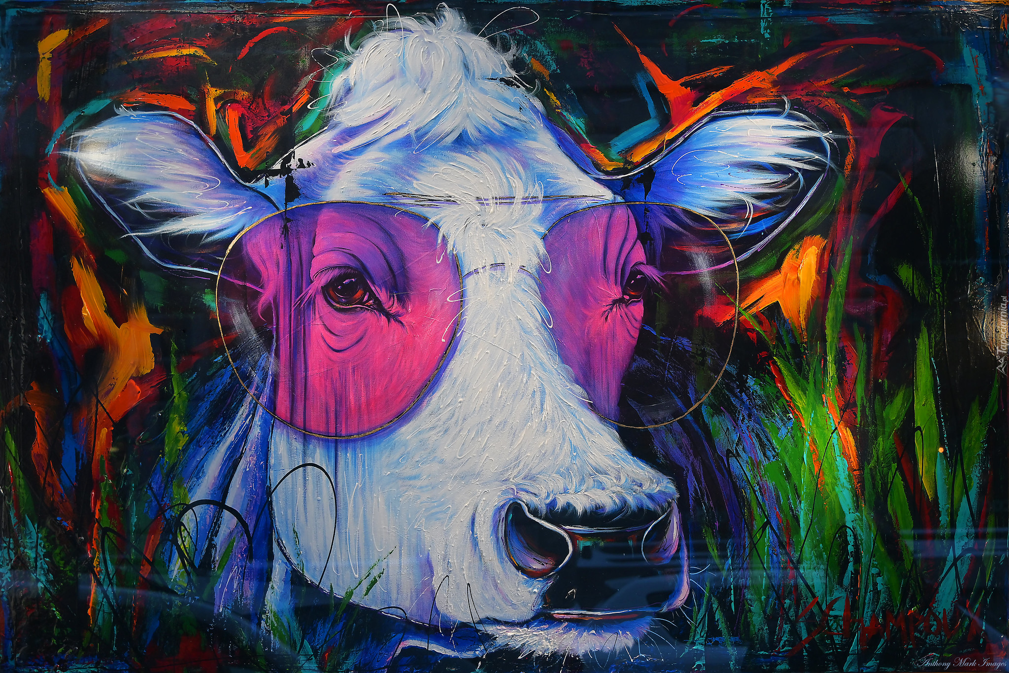 Edytor tapety: Głowa krowy w różowych okularach na obrazie