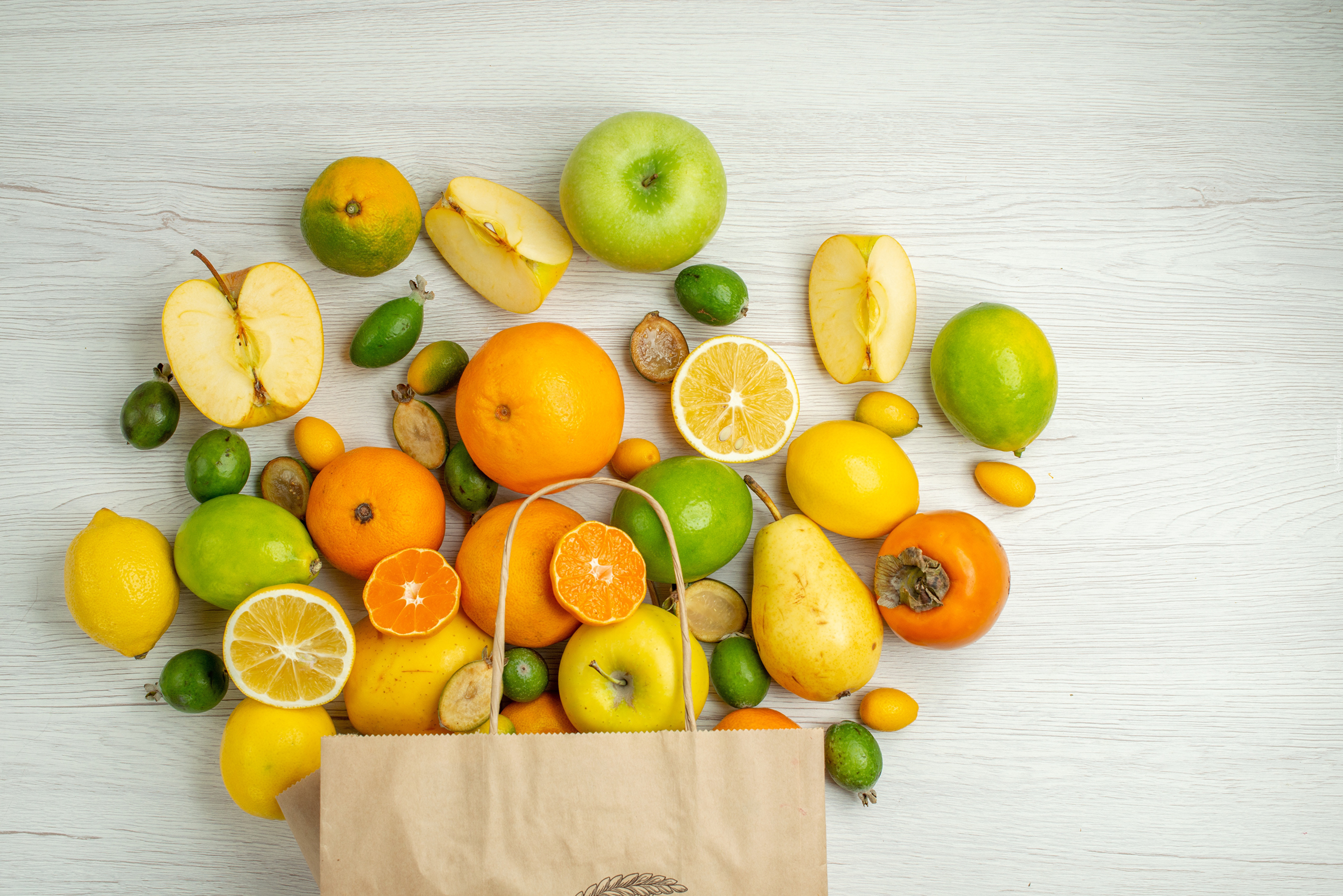 Edytor tapety: Różne owoce wysypane z papierowej torby