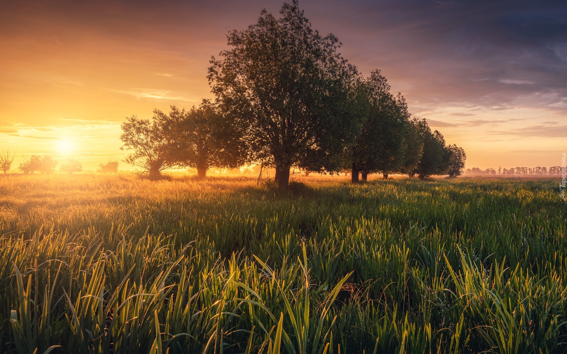 Edytor tapety: Drzewa na łące w blasku wschodzącego słońca