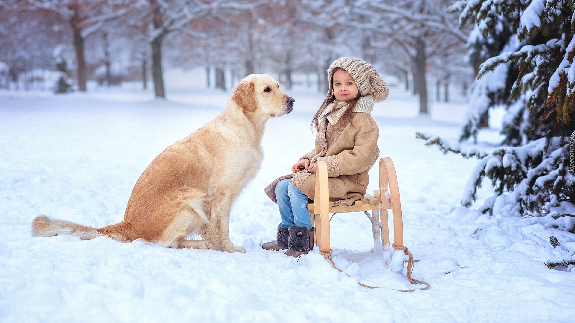 Edytor tapety: Golden retriever i dziewczynka na sankach