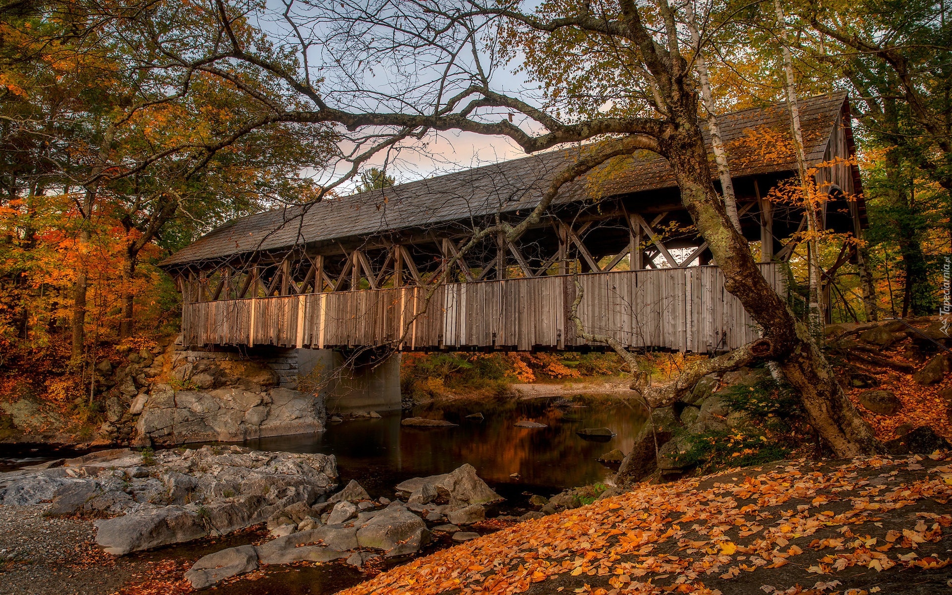 Edytor tapety: Kryty most nad rzeką jesienią
