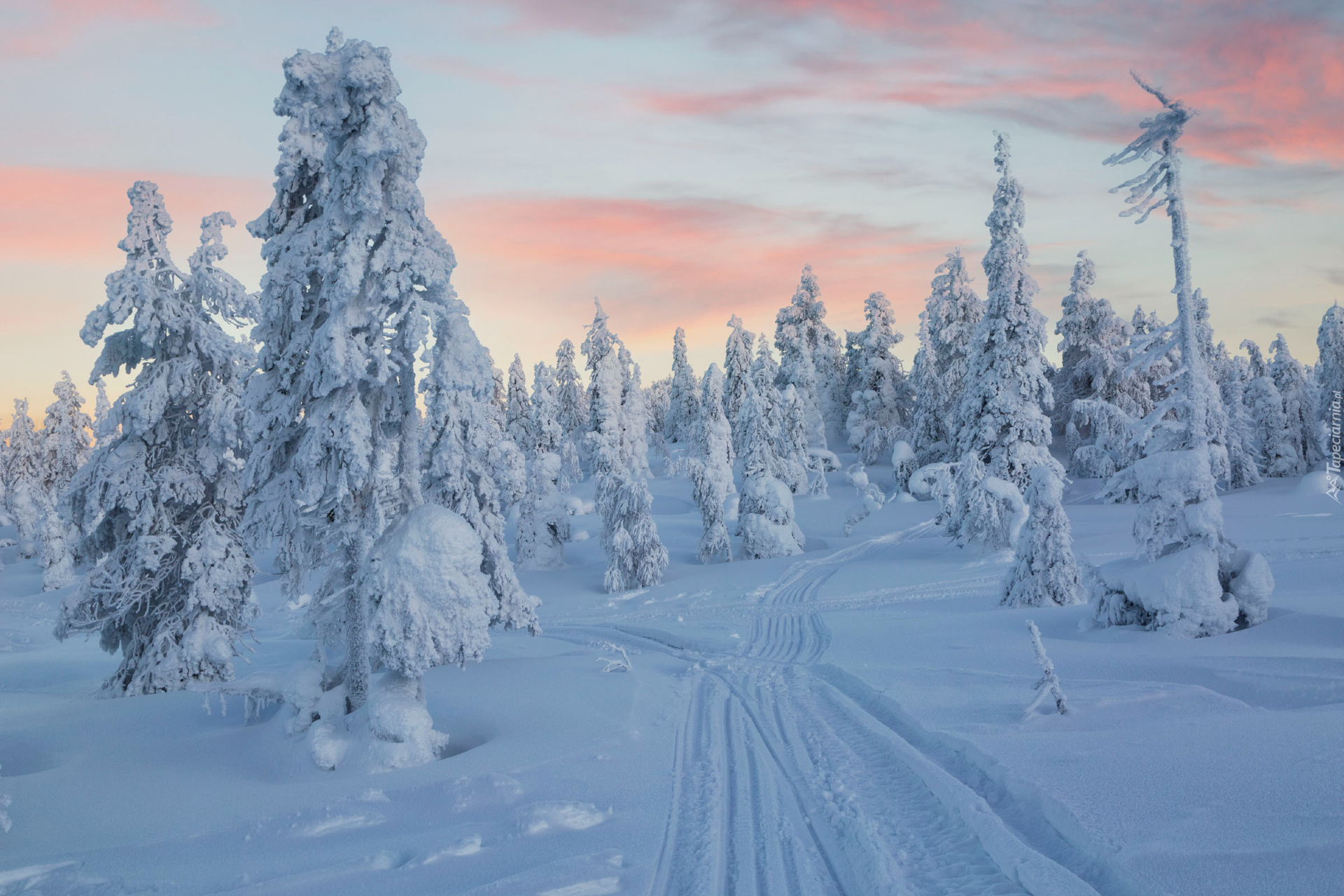 Edytor tapety: Ślady na drodze i ośnieżone drzewa w zaspach