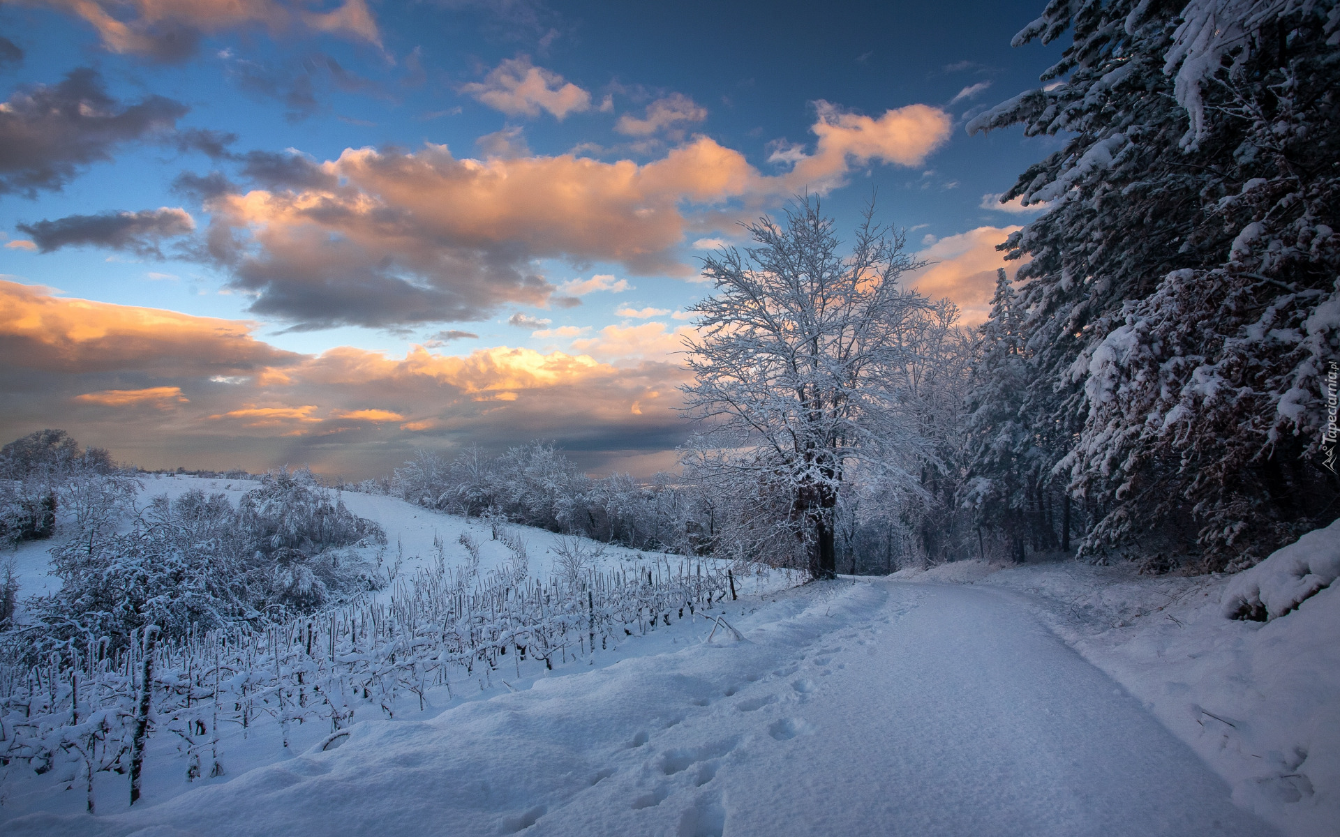 Edytor tapety: Ślady w śniegu na drodze i ośnieżone drzewa