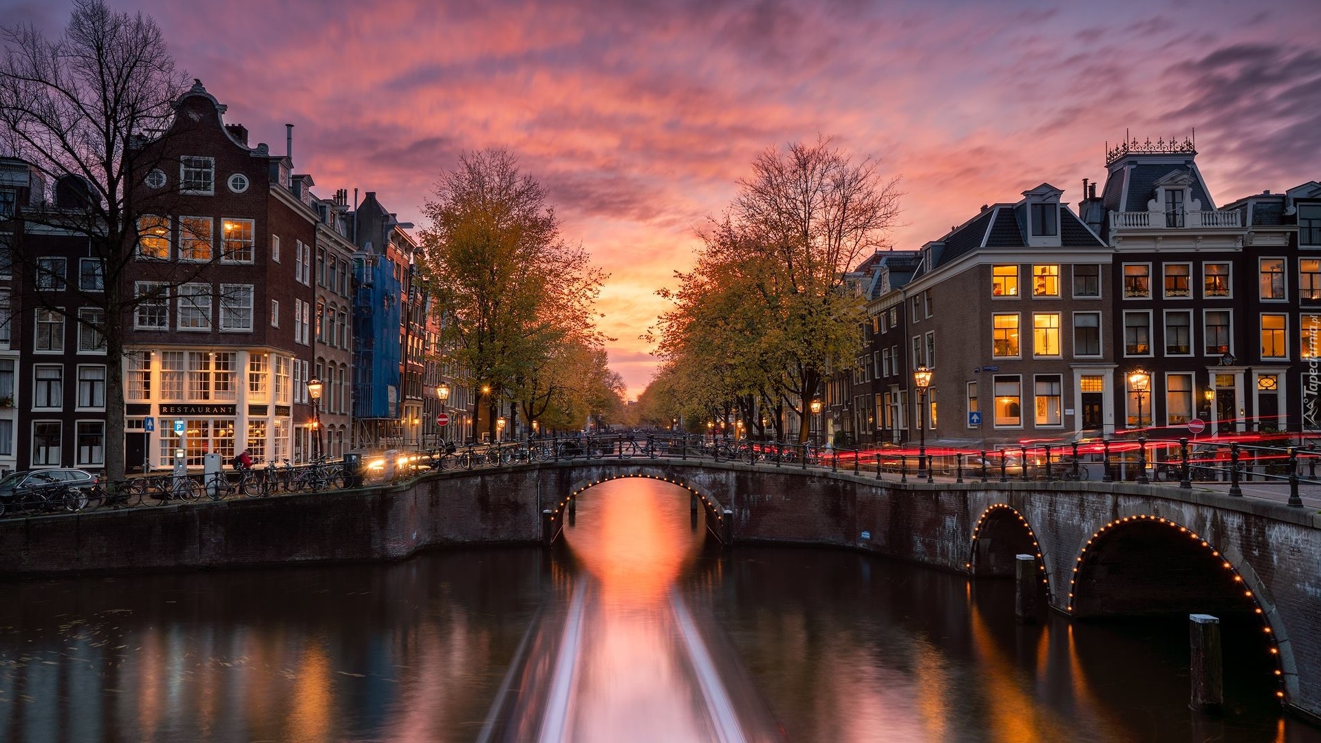 Edytor tapety: Kanał wodny Leidsegracht w Holandii o zachodzie słońca