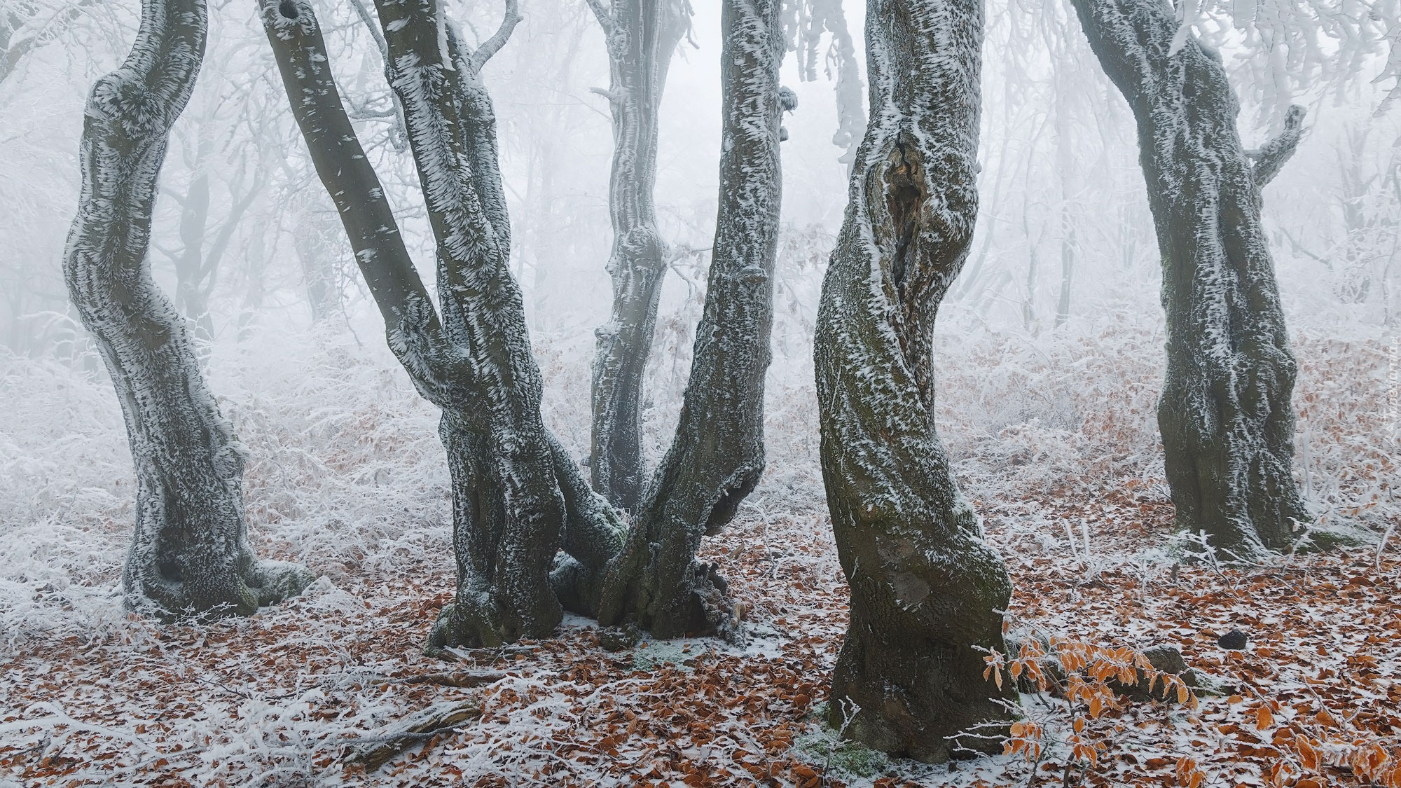 Edytor tapety: Oszronione opadłe liście pod drzewami w zamglonym lesie