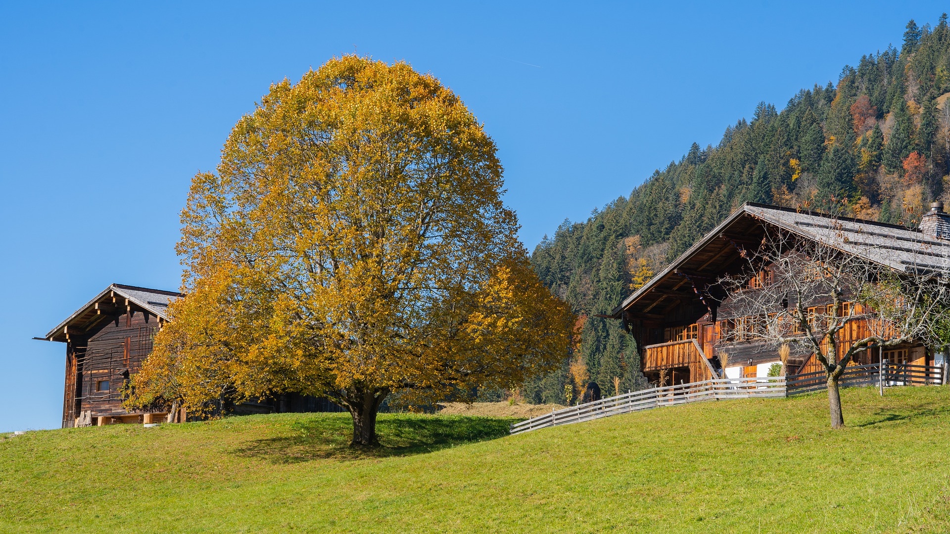 Edytor tapety: Drzewo i domy na wzgórzu pod zalesioną górą
