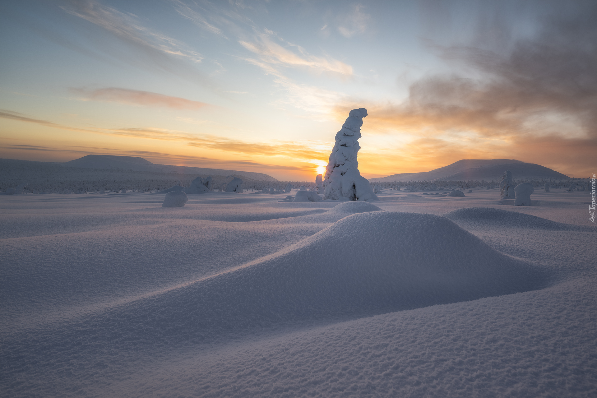 Edytor tapety: Ośnieżone drzewo i zaspy pod kolorowym niebem