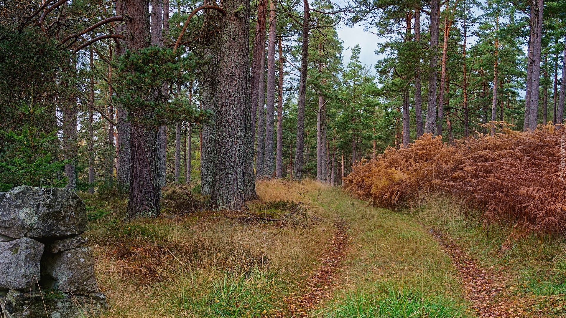 Edytor tapety: Pożółkłe paprocie przy trawiastej ścieżce w lesie