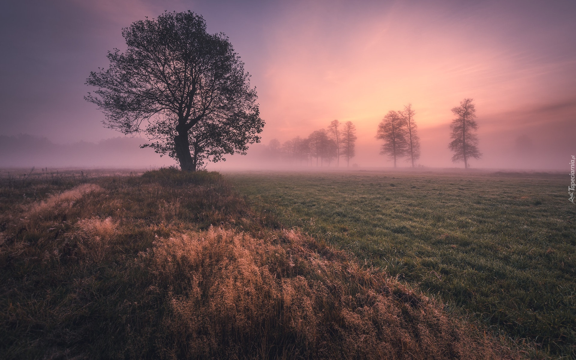 Edytor tapety: Drzewa na zamglonej o wschodzie słońca łące