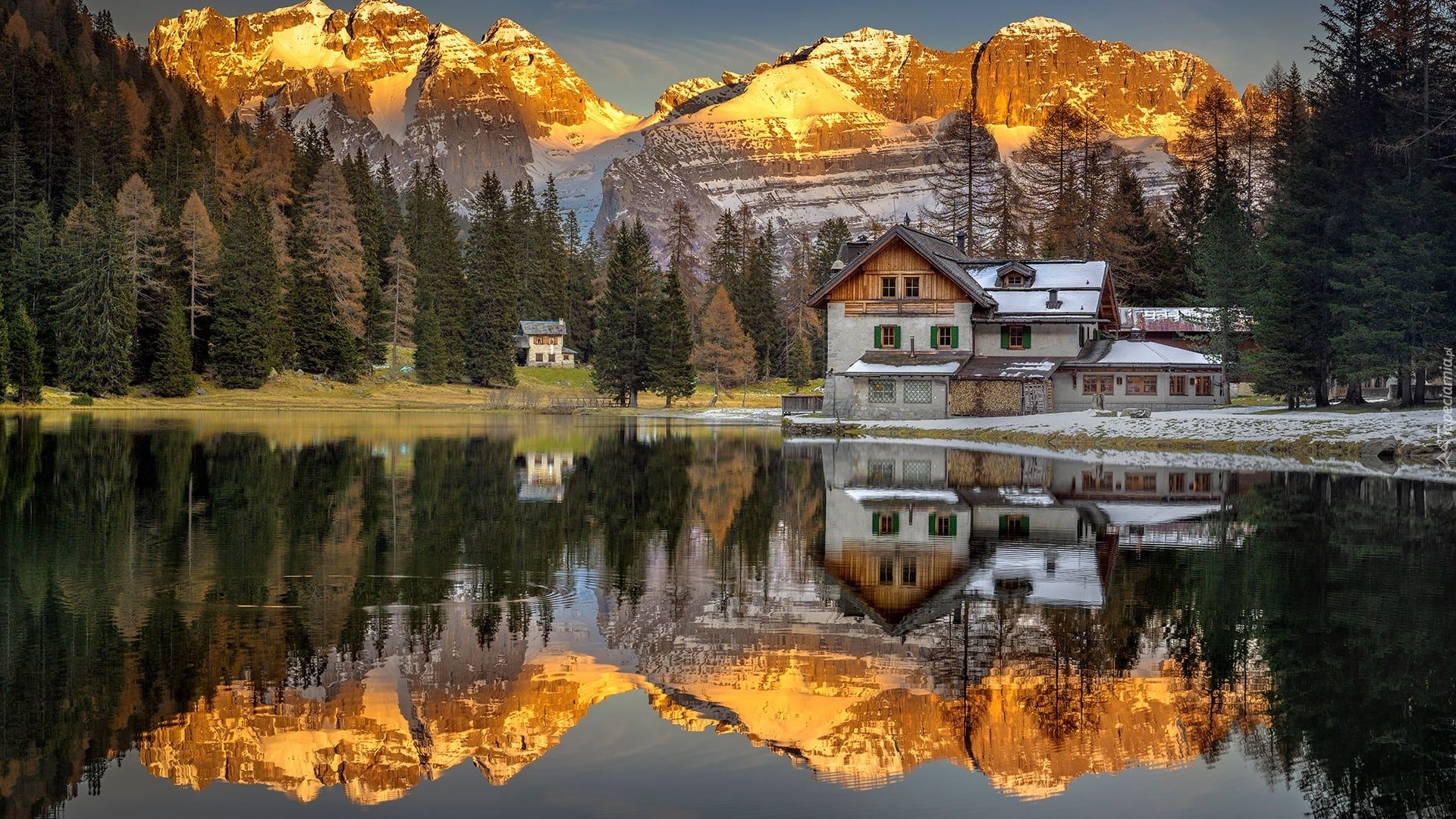 Edytor tapety: Odbicie domów i rozświetlonych gór w jeziorze