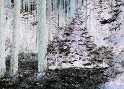 Edytor tapety: Ośnieżone niskie drzewka iglaste pod wysokimi drzewami