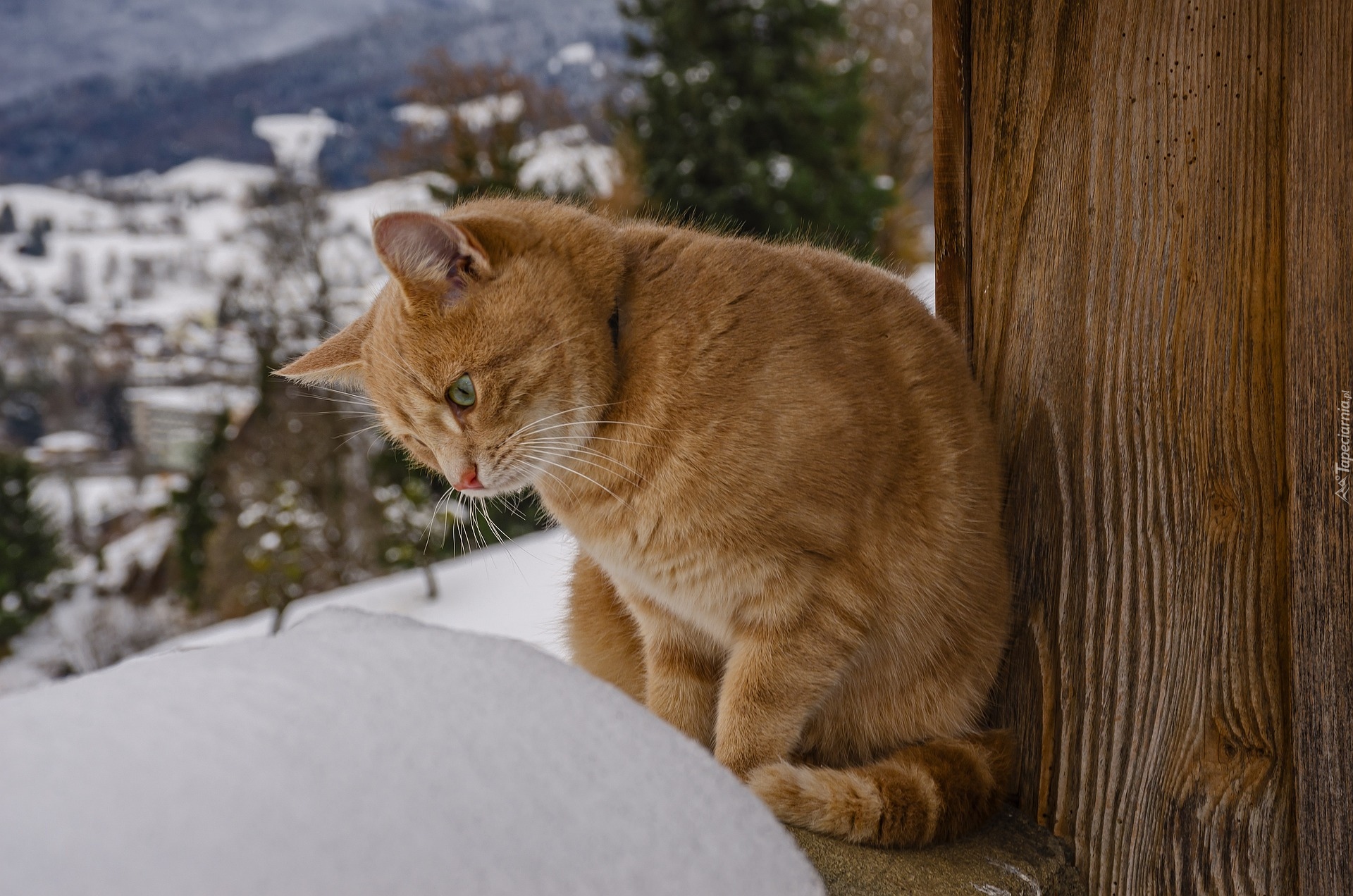 Edytor tapety: Rudy kot patrzący na śnieg