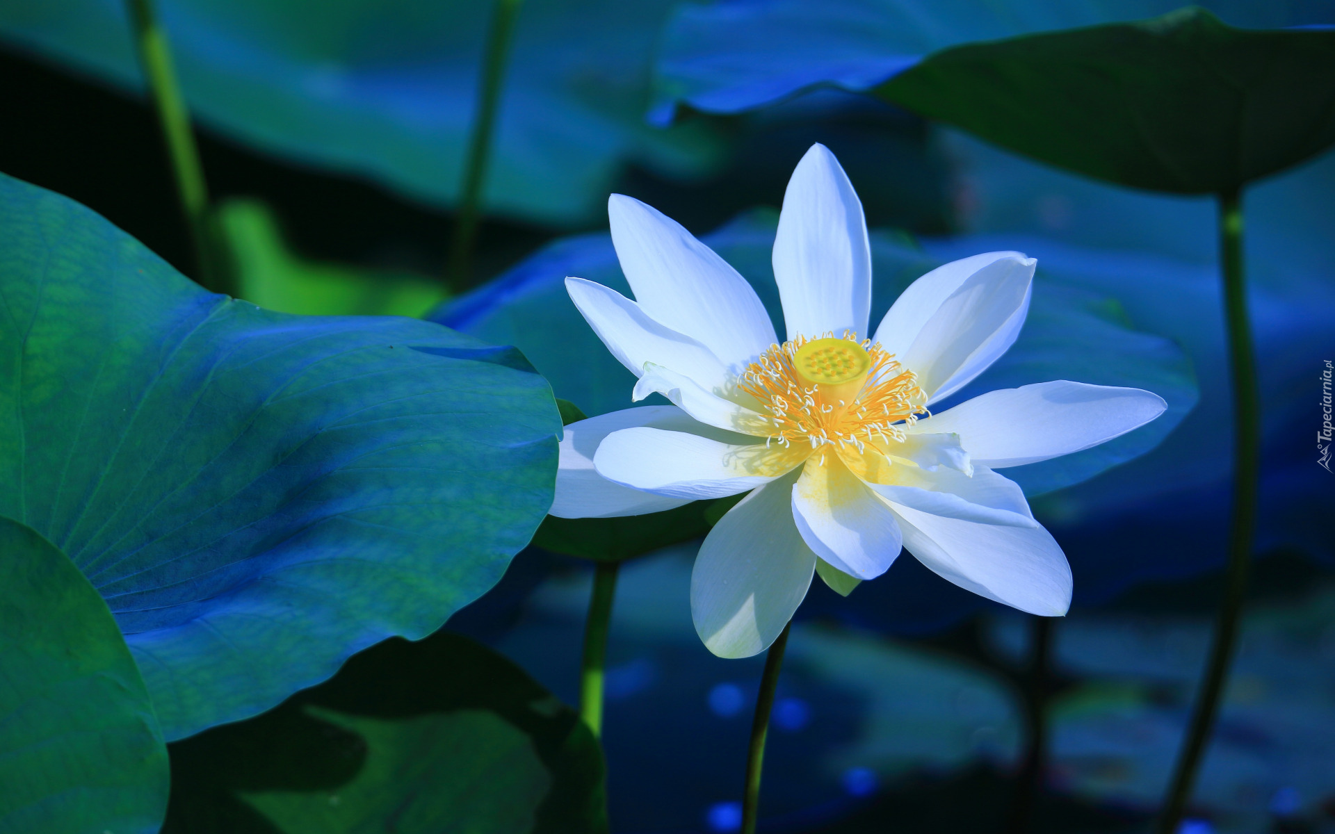 Edytor tapety: Rozświetlony słońcem biały lotos w wodzie