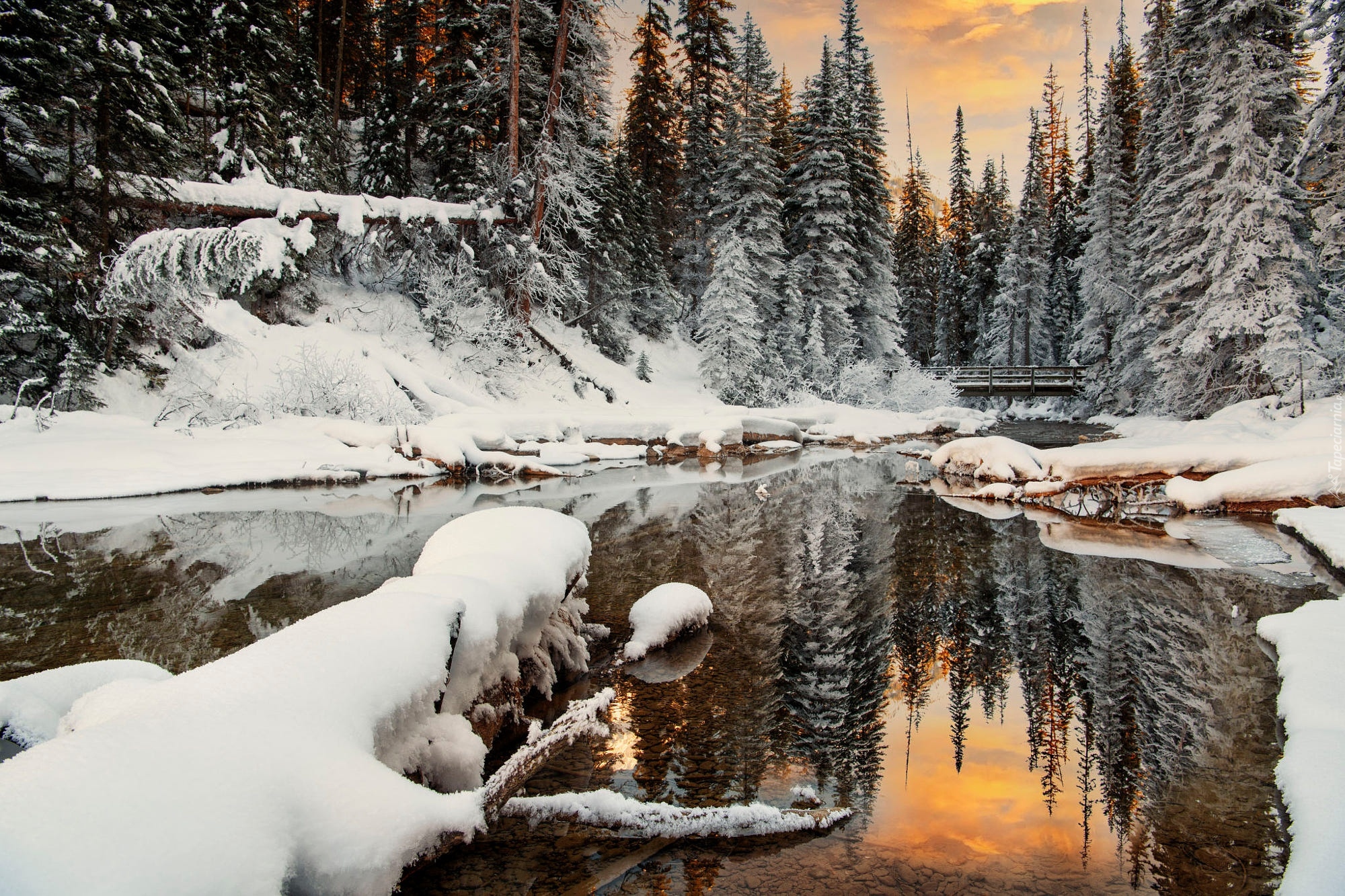 Edytor tapety: Płynąca rzeka przez zaśnieżony las