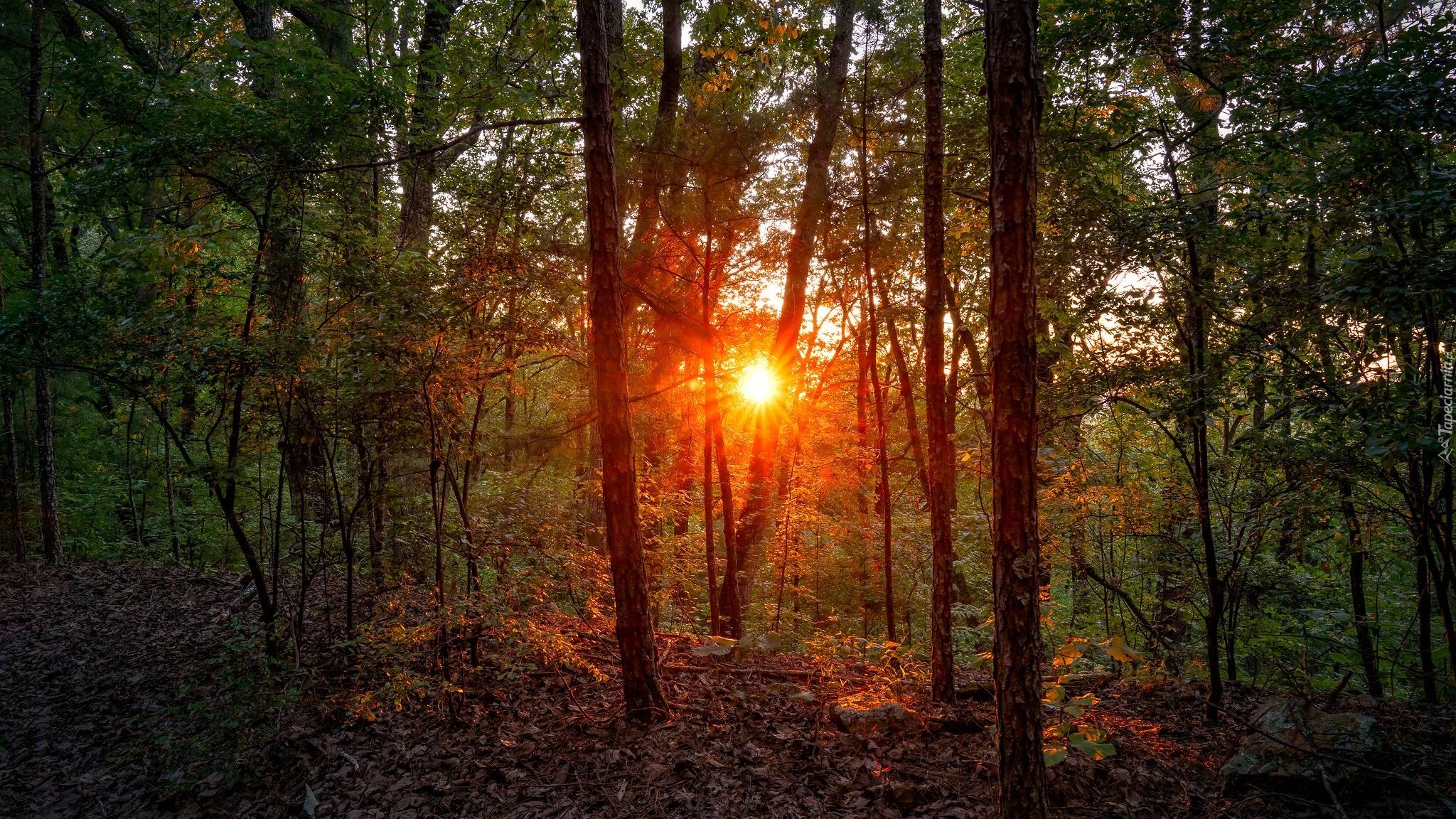 Edytor tapety: Słońce wśród drzew w lesie liściastym