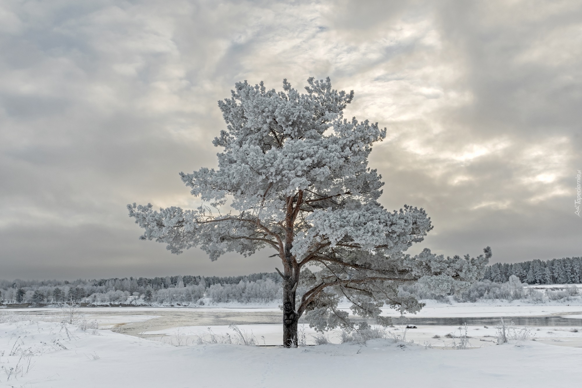 Edytor tapety: Oszronione drzewo na polu pod zachmurzonym niebem