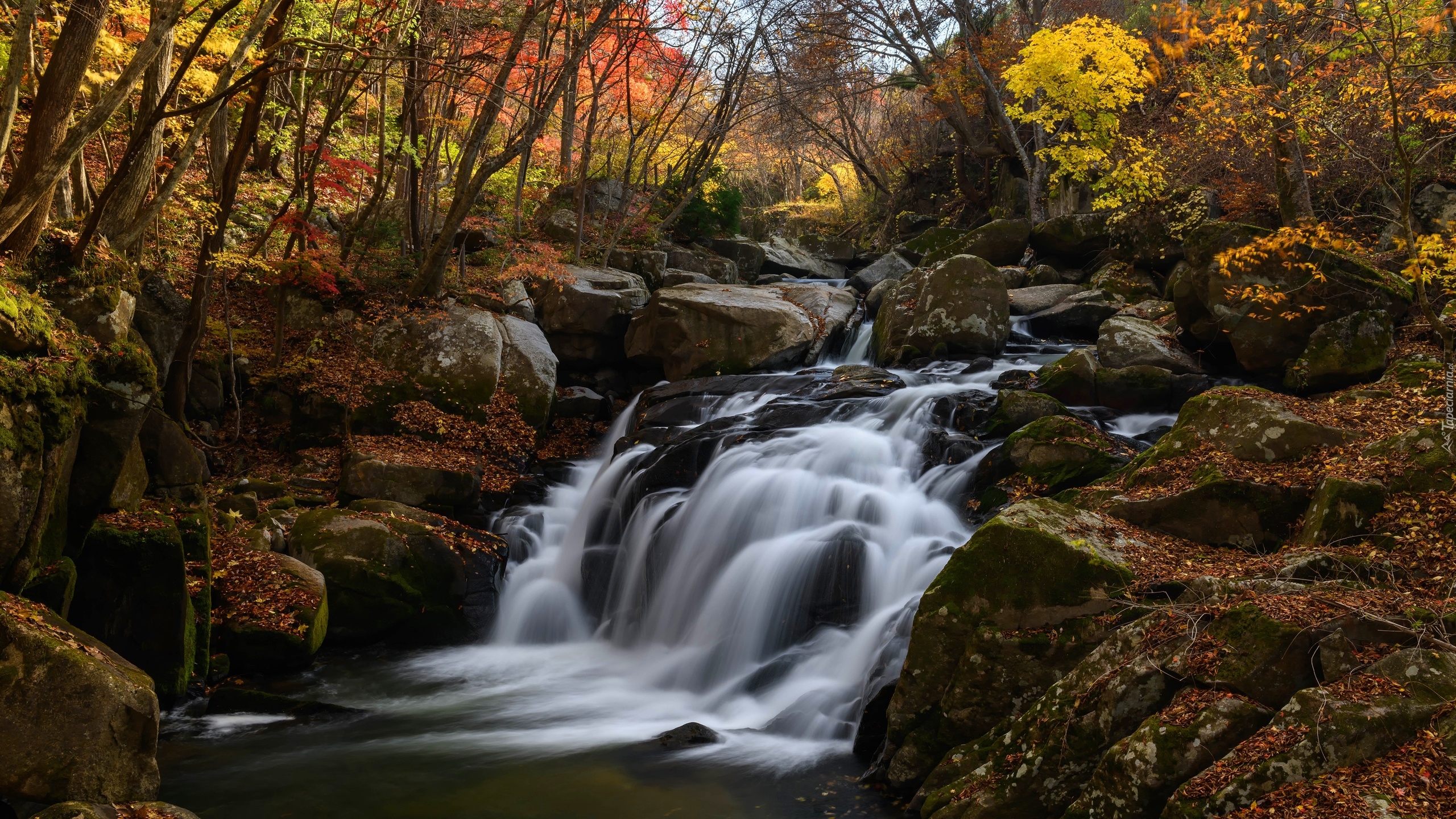 Edytor tapety: Potok spływający po kamieniach w lesie jesienią