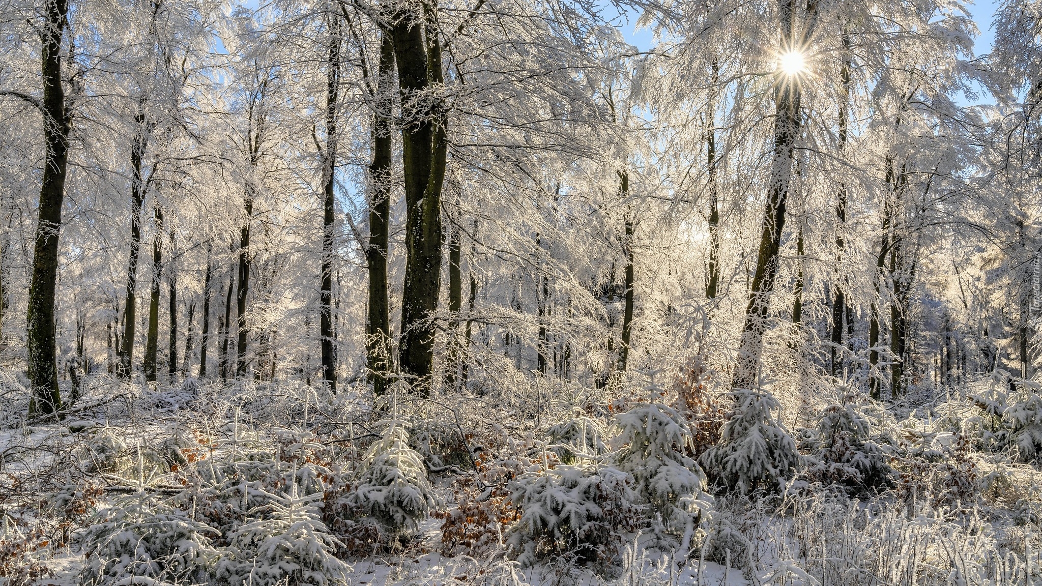 Edytor tapety: Poranne słońce w zimowym lesie