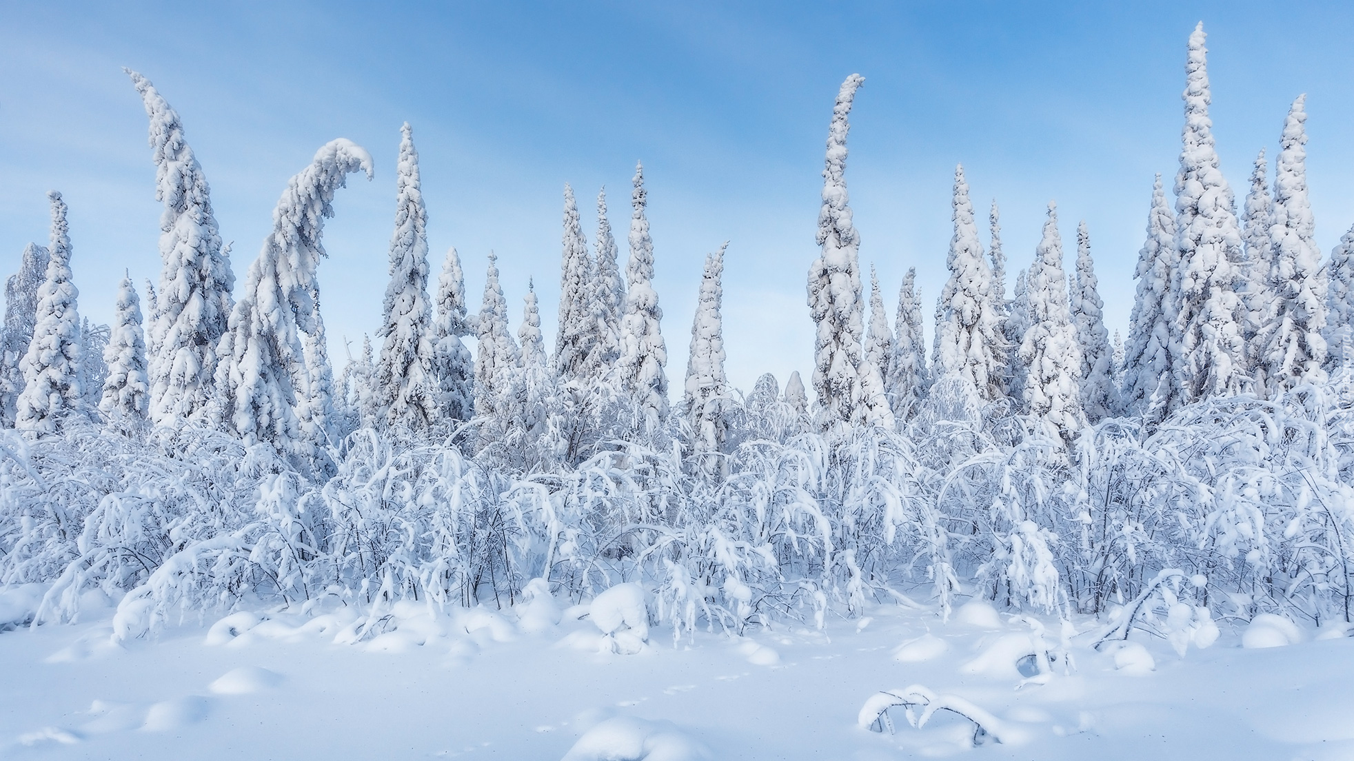 Edytor tapety: Ośnieżone drzewa i krzewy na skraju lasu