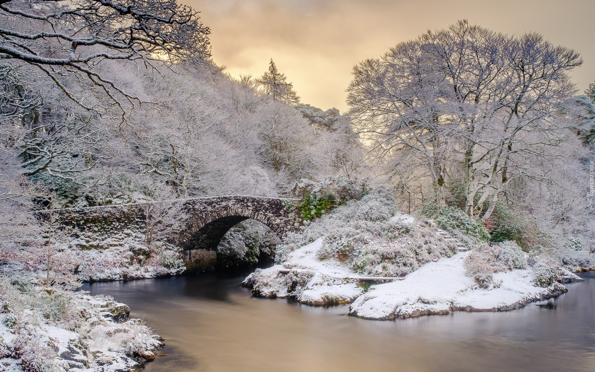 Edytor tapety: Ośnieżone drzewa przy kamiennym moście nad rzeką