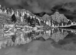 Edytor tapety: Pożółkłe drzewa nad górskim jeziorem i góry w tle