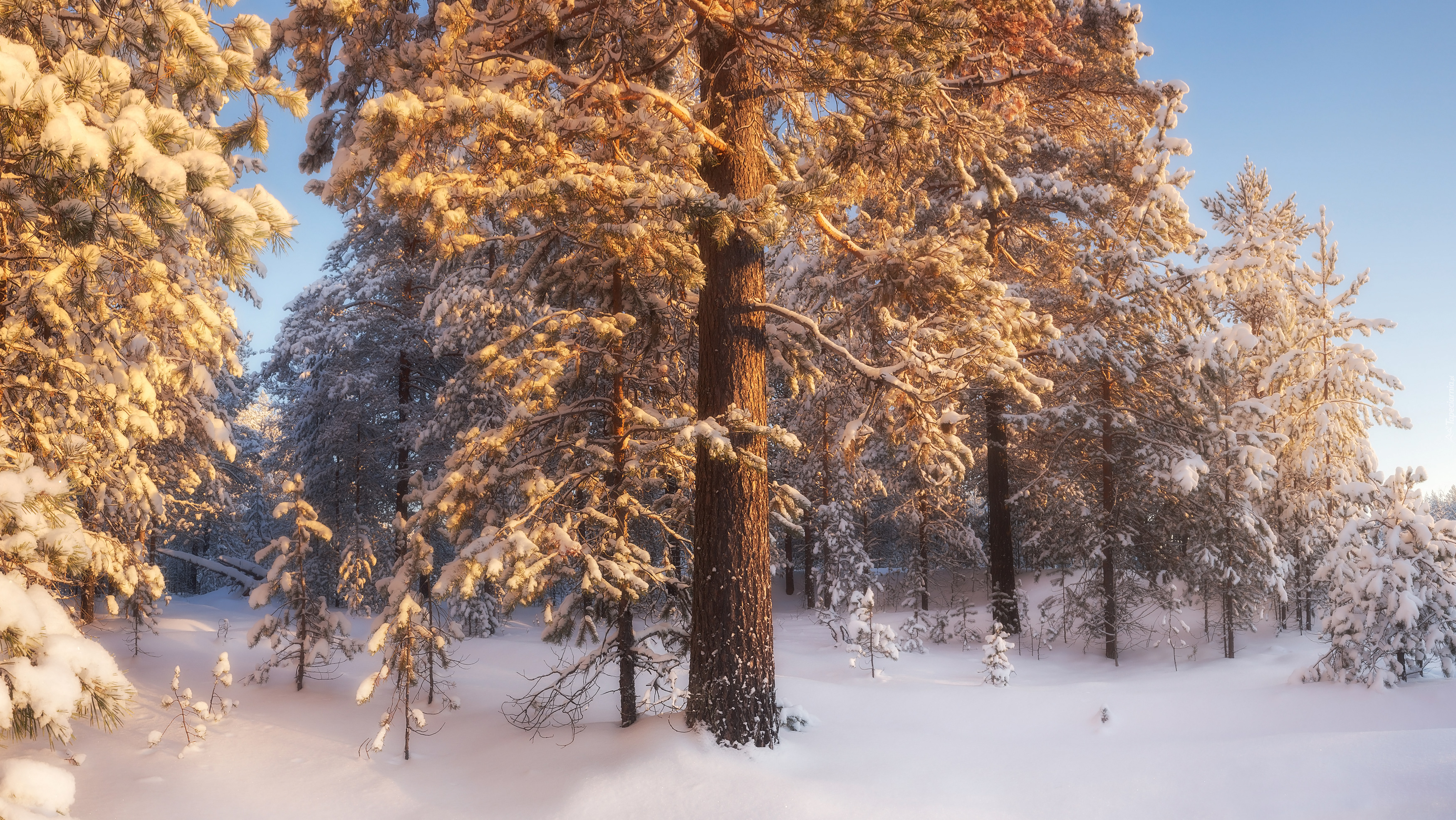 Edytor tapety: Rozświetlone słońcem ośnieżone drzewa iglaste w lesie