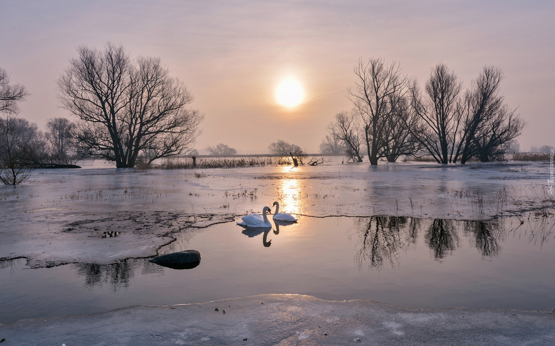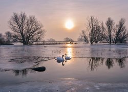 Edytor tapety: Łabędzie na zamarzającym jeziorze pod zamglonym słońcem