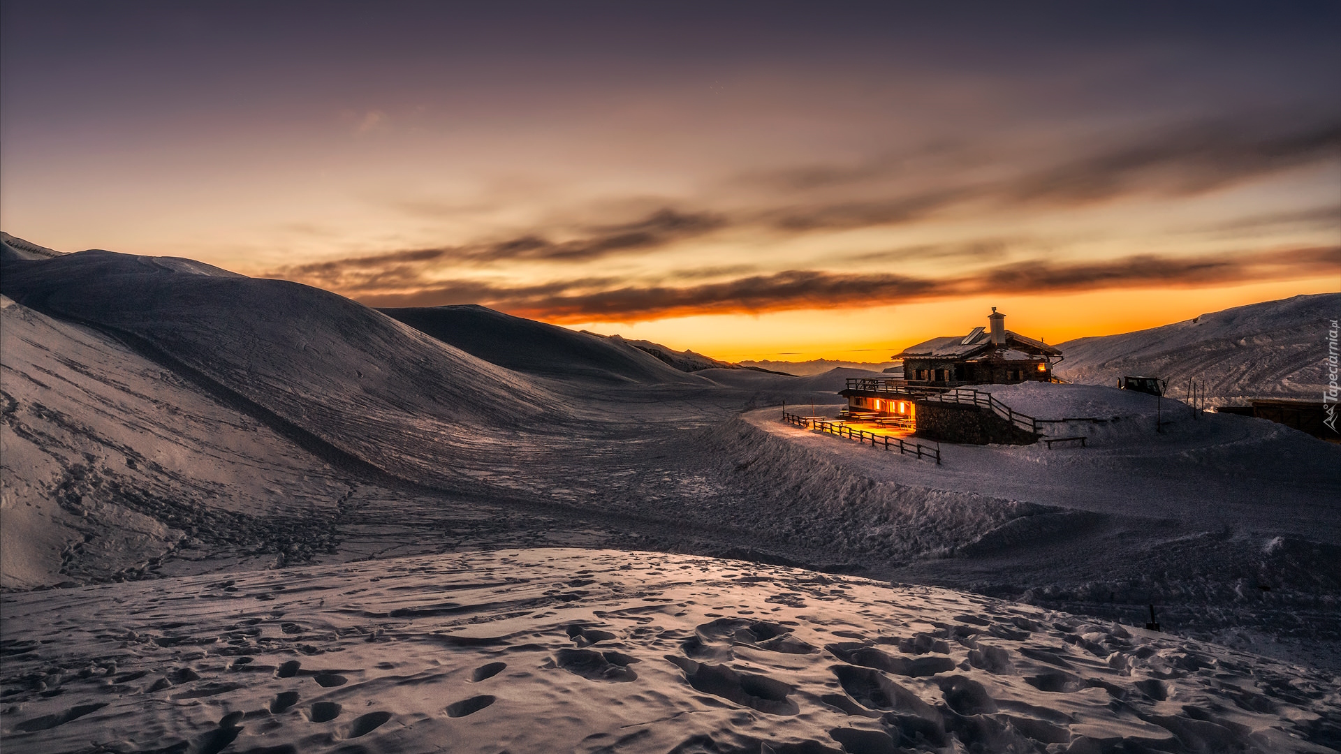 Edytor tapety: Oświetlone schronisko Baita Segantini w zimowej scenerii
