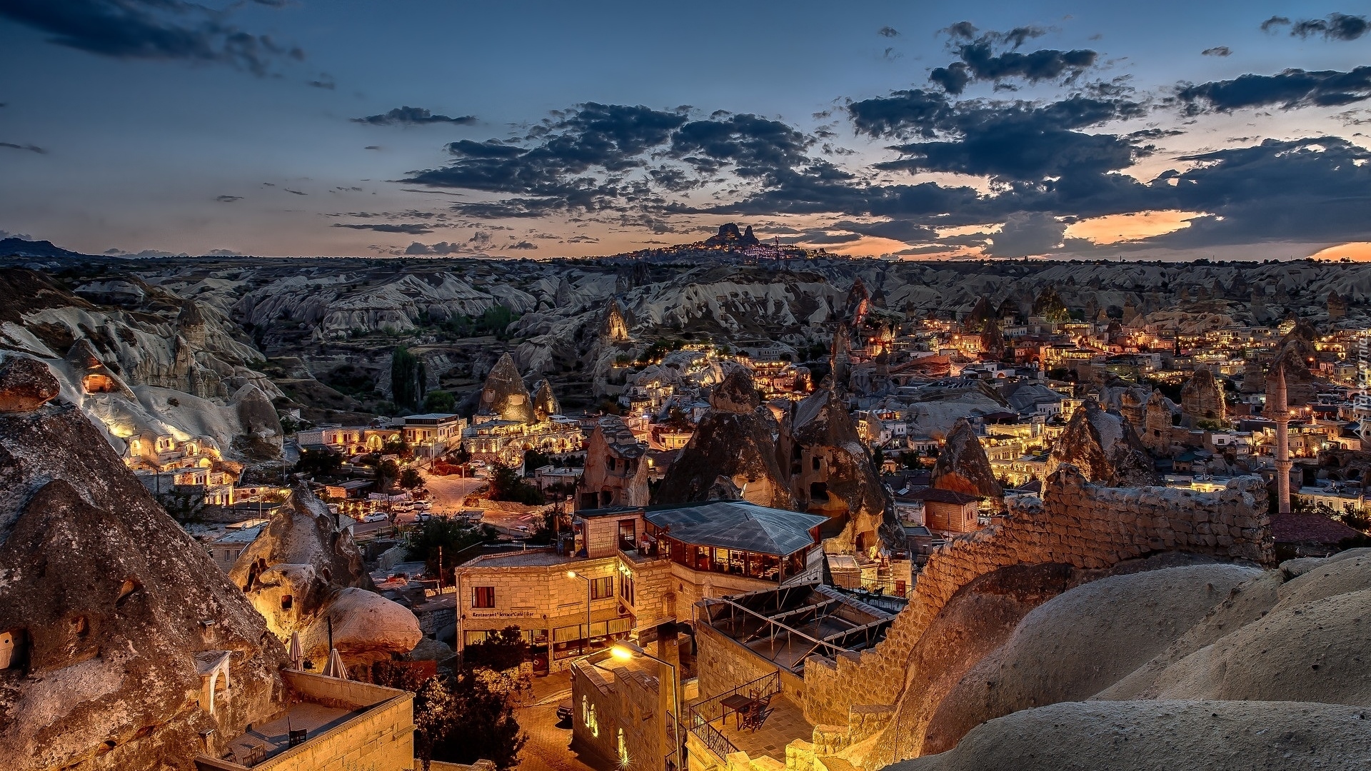 Edytor tapety: Oświetlone o zmroku tureckie miasto Goreme