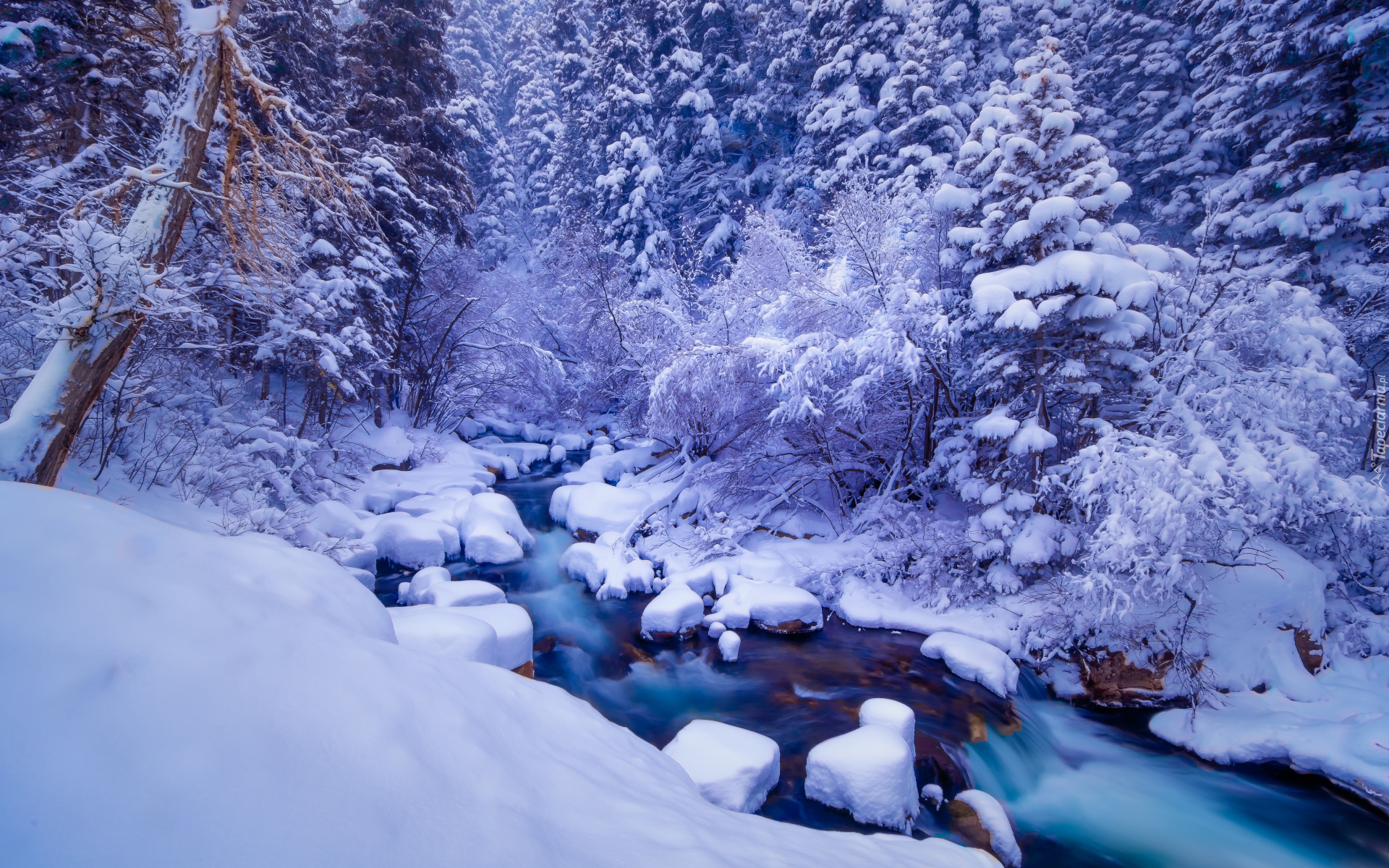 Edytor tapety: Ośnieżone drzewa i kamienie na leśnej rzece