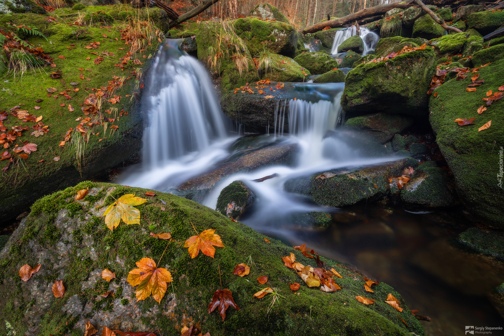 Edytor tapety: Omszałe głazy przy kamienistym potoku w lesie