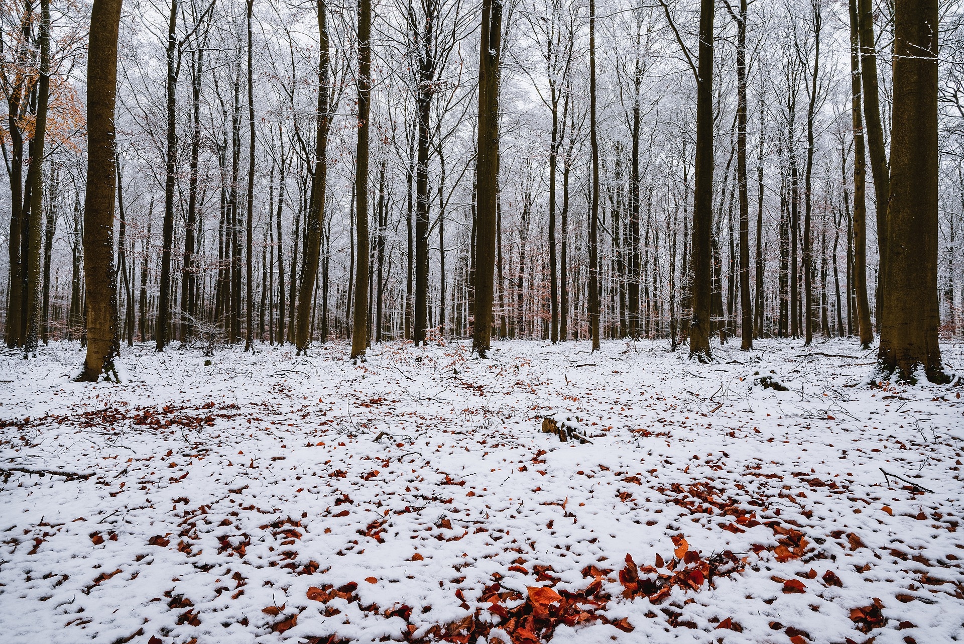 Edytor tapety: Śnieg na opadłych liściach pod drzewami w lesie