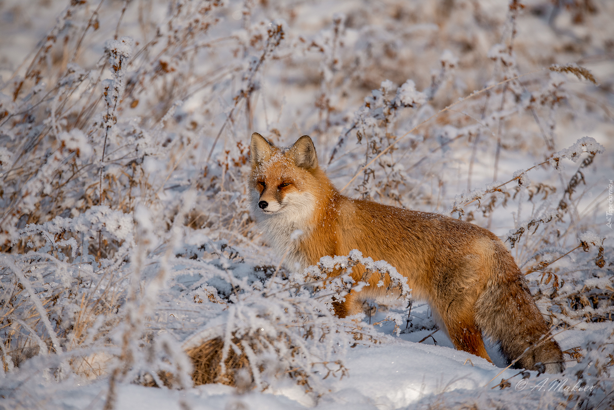 Edytor tapety: Rudy lis wśród ośnieżonych roślin