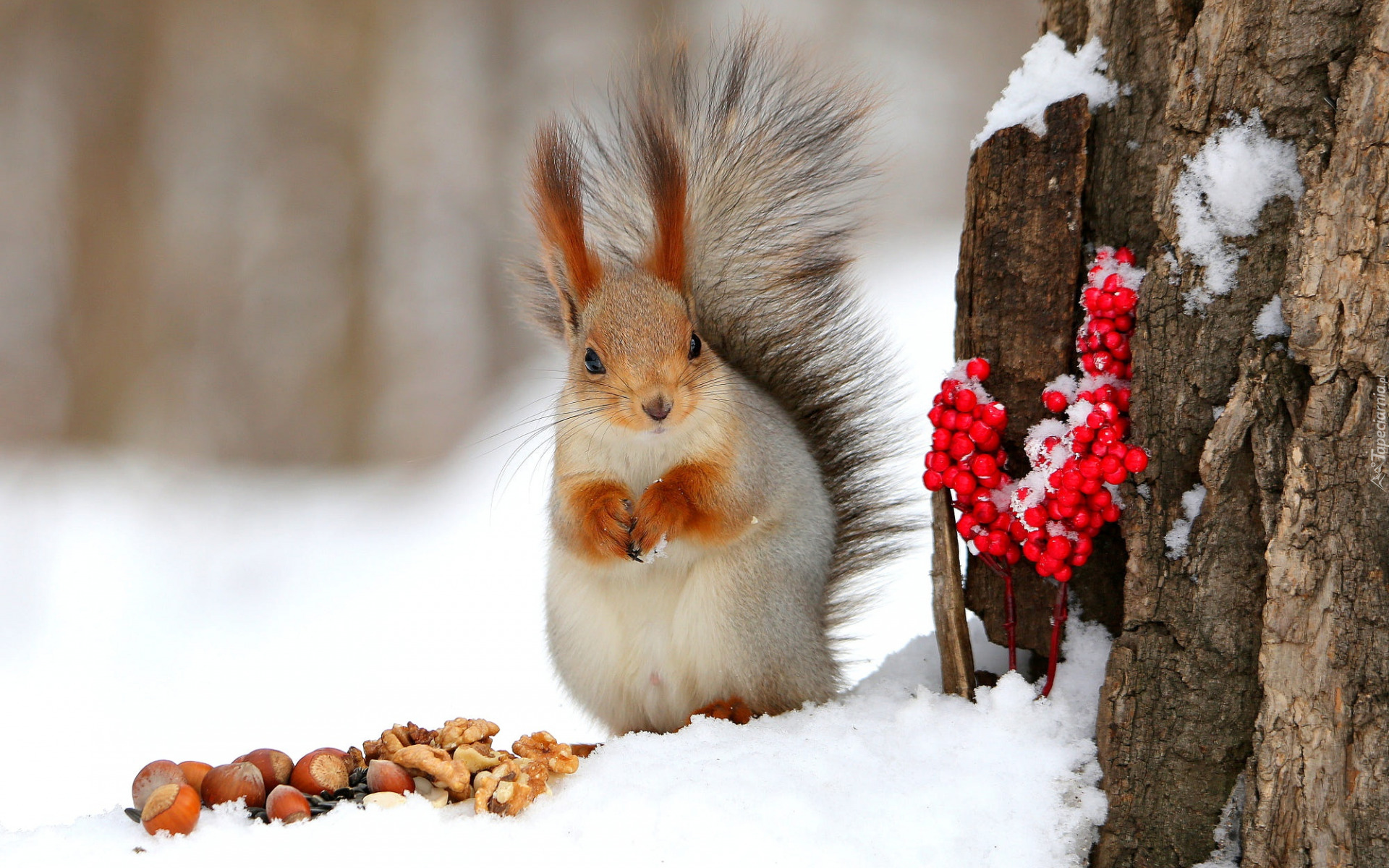 Edytor tapety: Wiewiórka i orzechy na śniegu obok drzewa