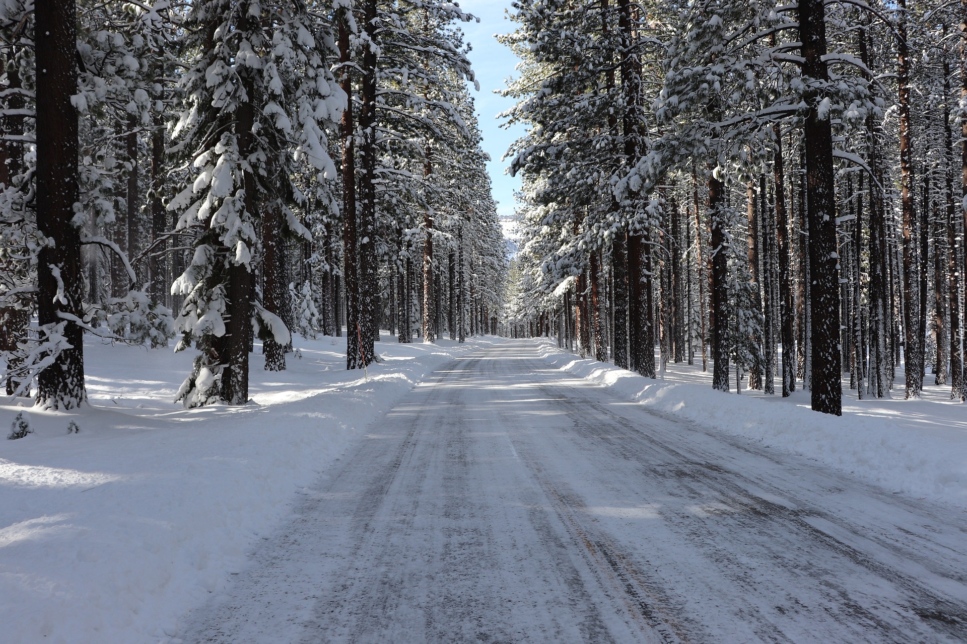 Edytor tapety: Ośnieżona droga przez zimowy las iglasty