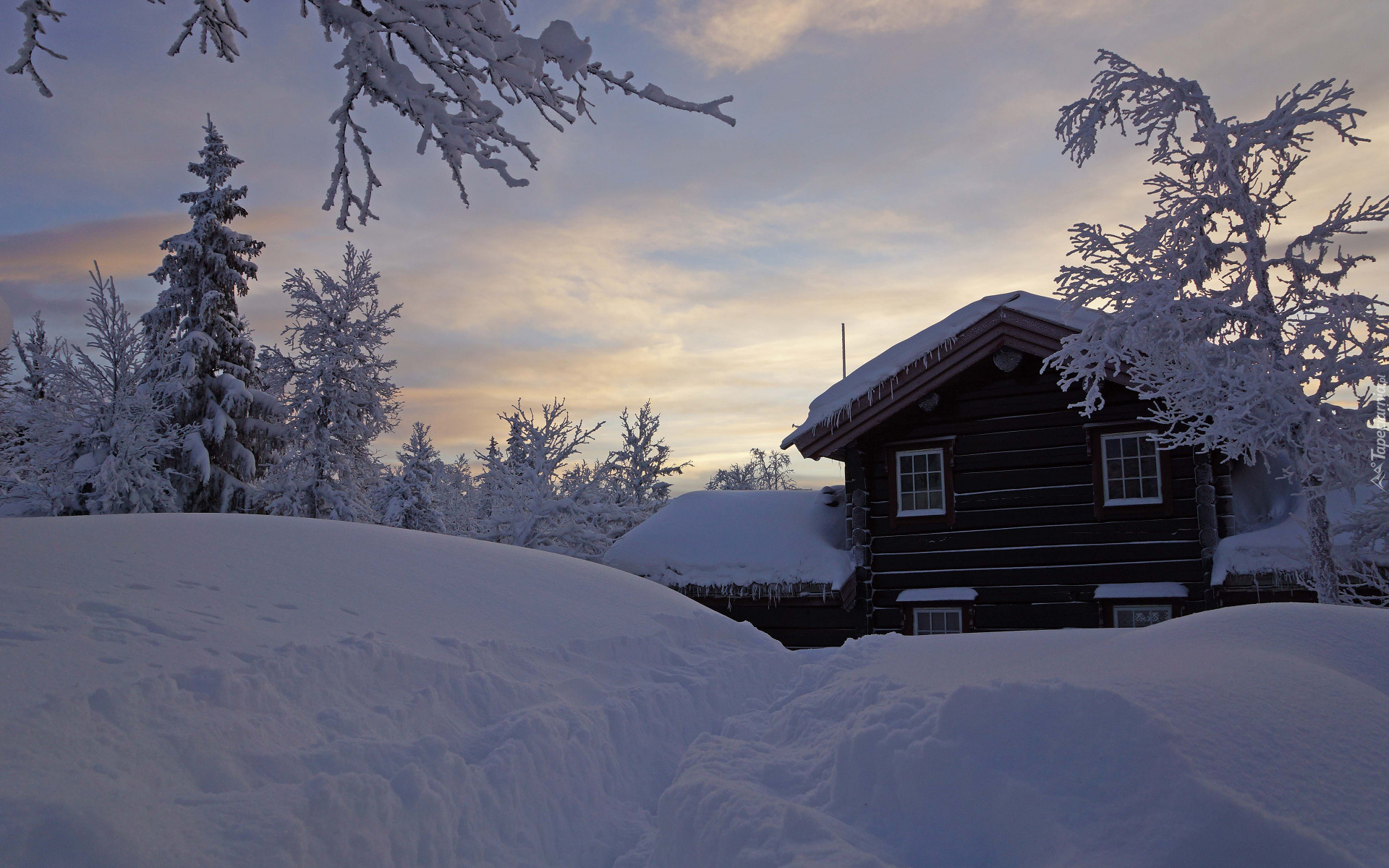 Edytor tapety: Ośnieżony dom w zaspach