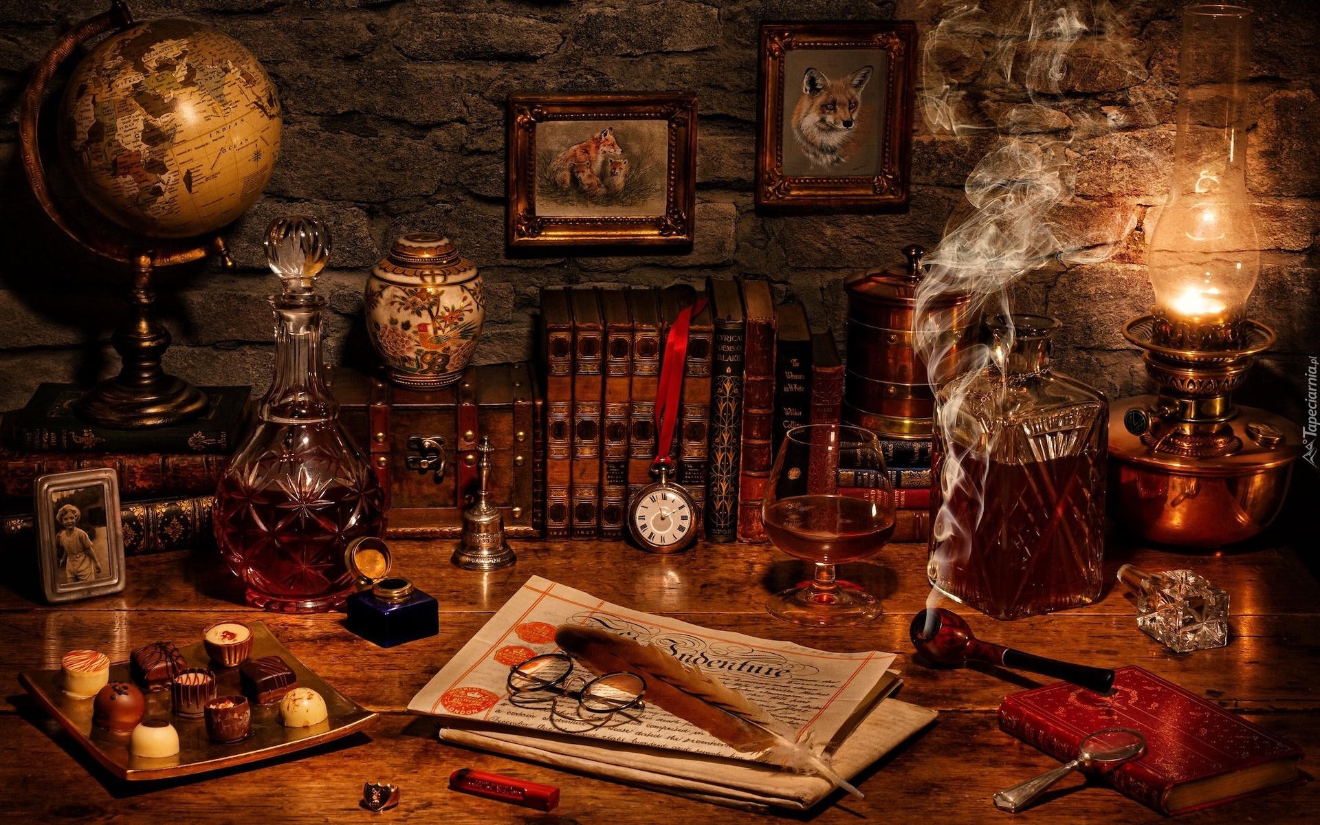 Edytor tapety: Lampa obok dymiącej fajki i karafek z alkoholem