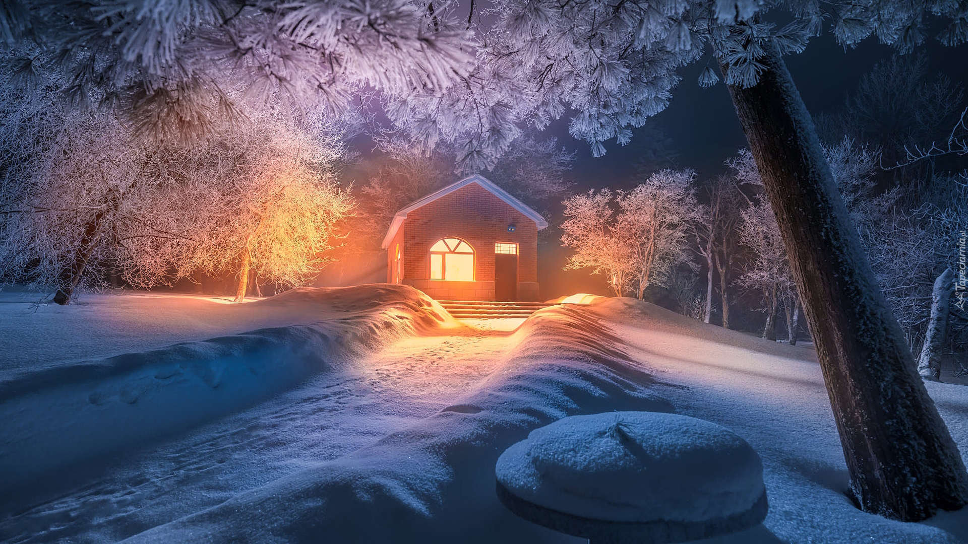 Edytor tapety: Ścieżka do oświetlonego domu i zaśnieżone drzewa