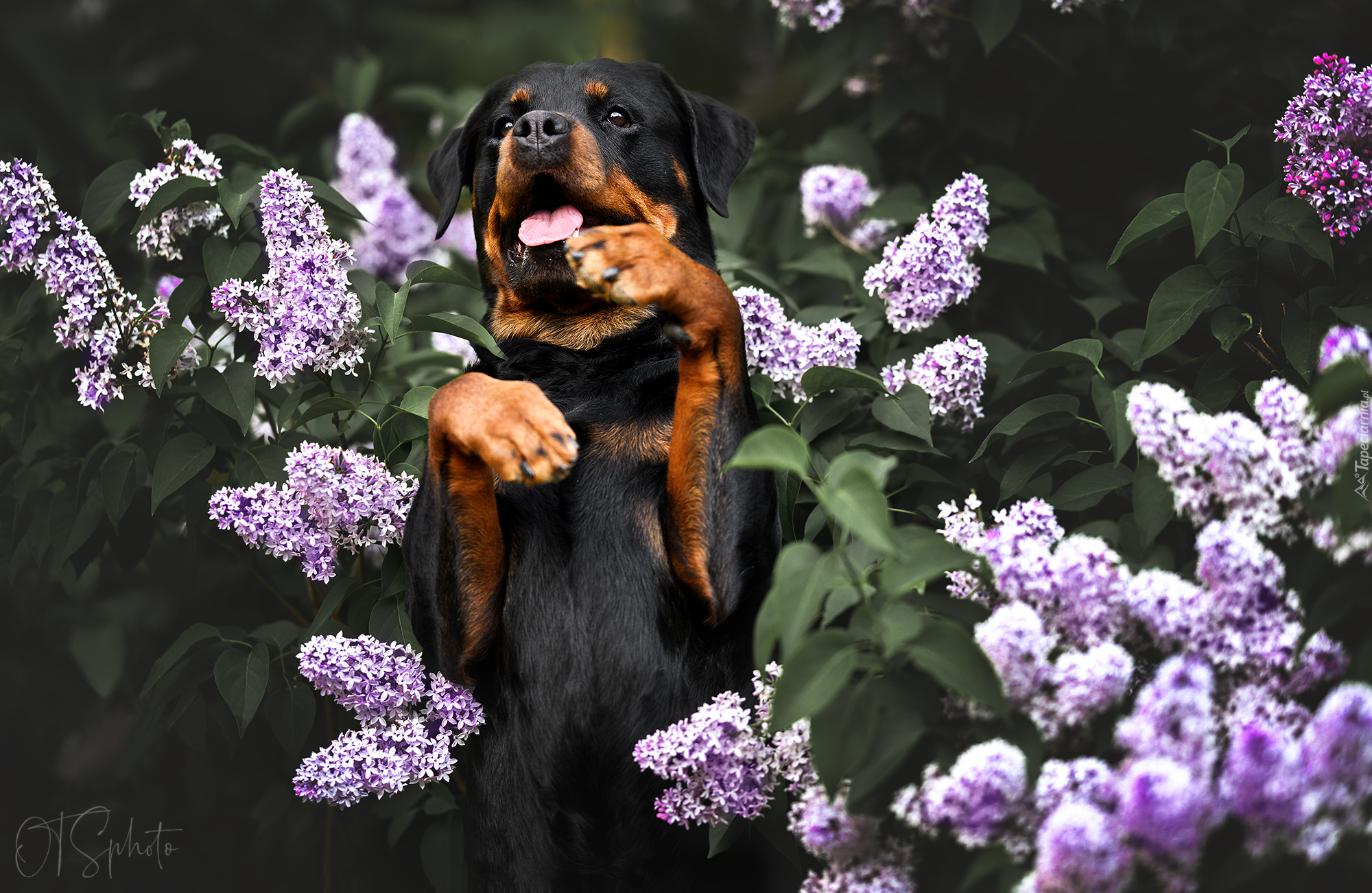 Edytor tapety: Rottweiler w gałązkach bzu