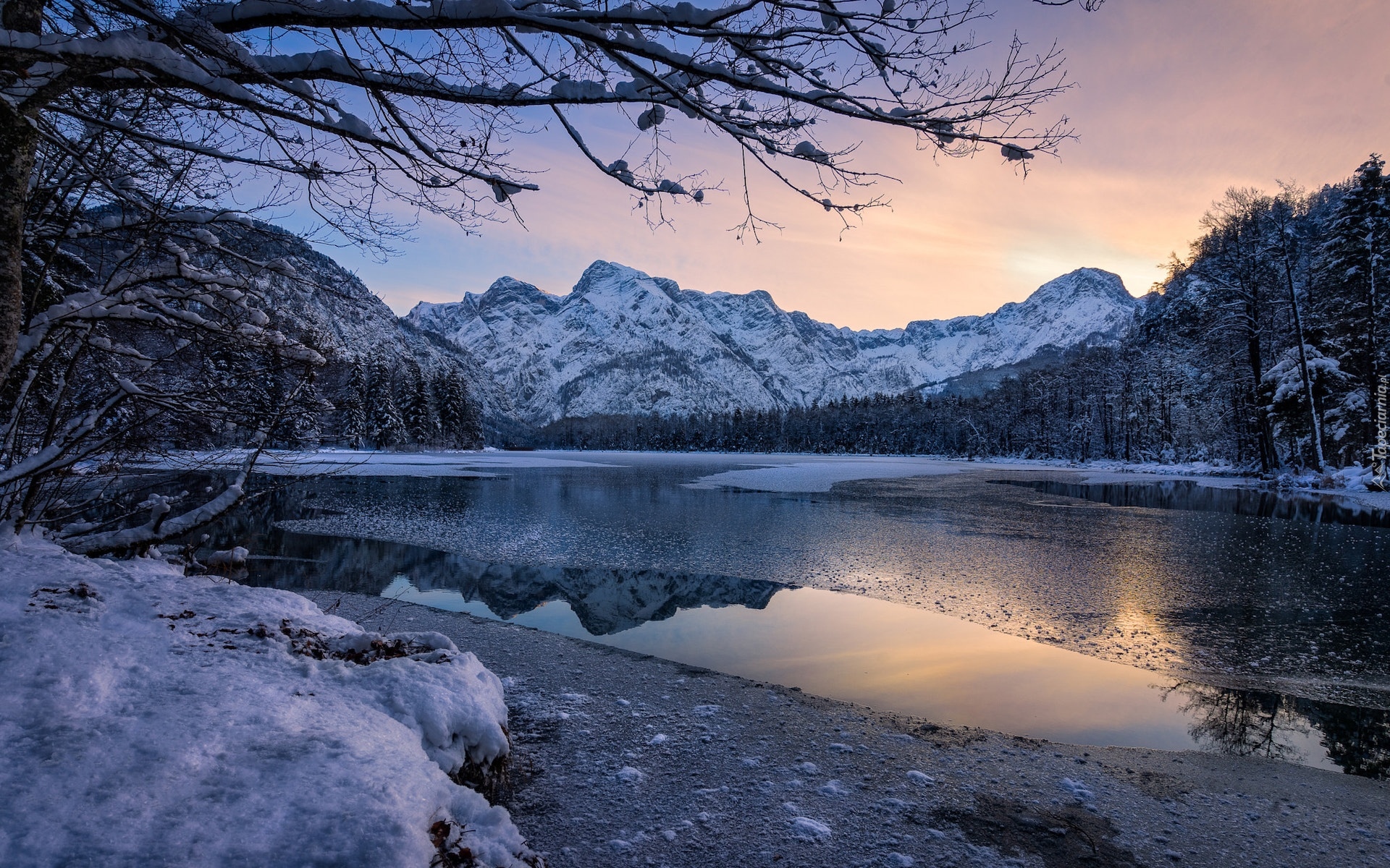 Edytor tapety: Oblodzone jezioro Almsee w Austrii