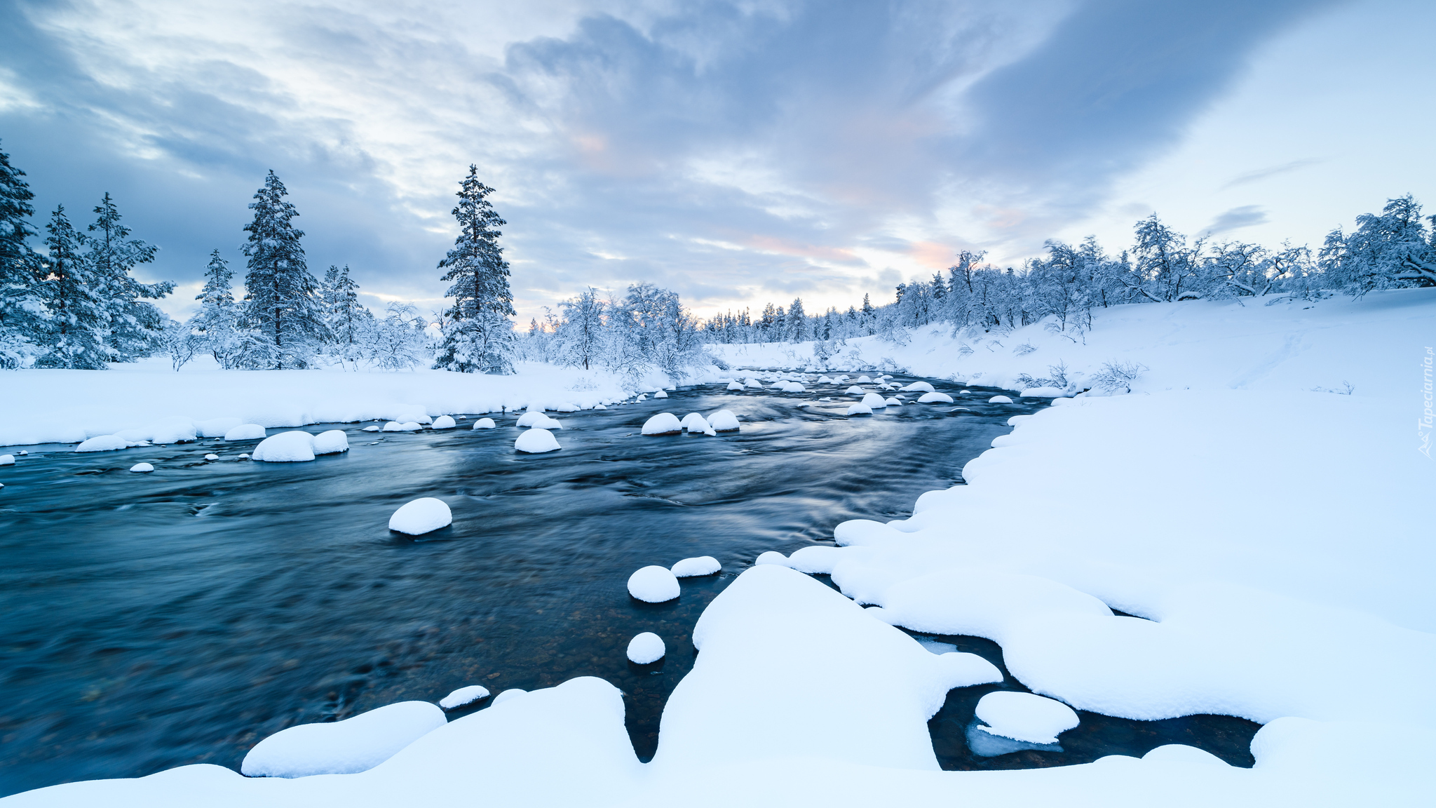 Edytor tapety: Drzewa na ośnieżonych brzegach rzeki zimą