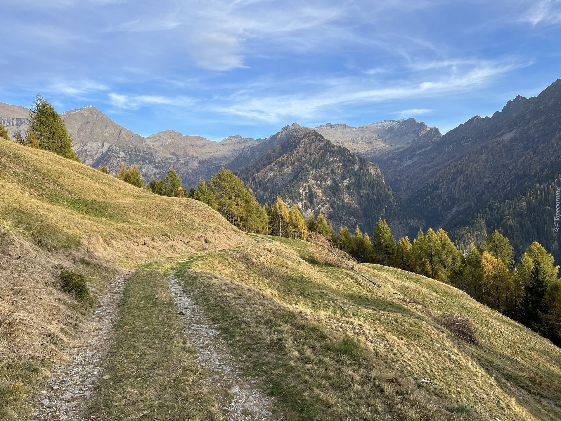 Edytor tapety: Trawiasta ścieżka na szczycie z widokiem na Alpy Lepontyńskie