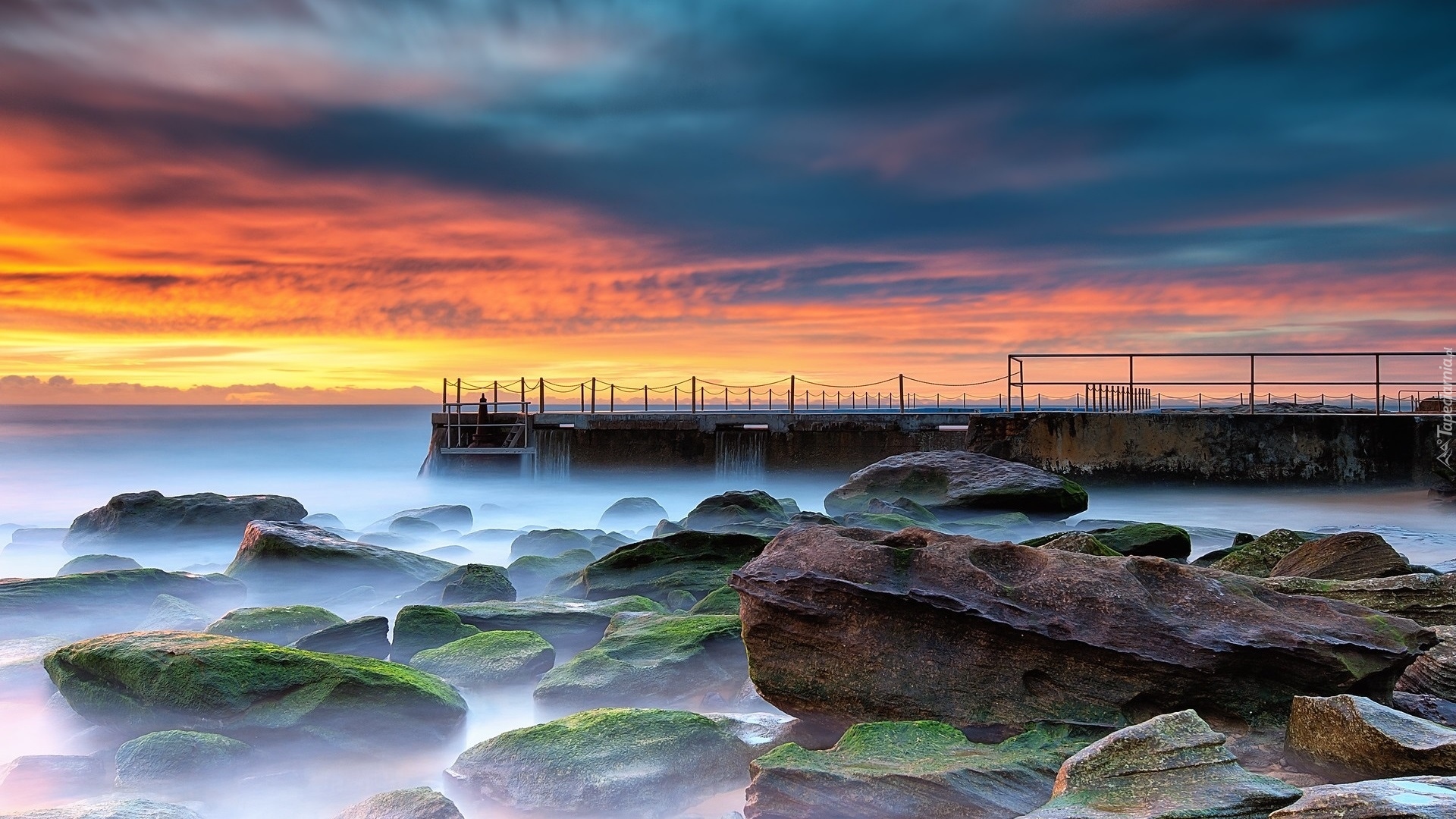 Edytor tapety: Molo pod kolorowym niebem i kamienie w morzu