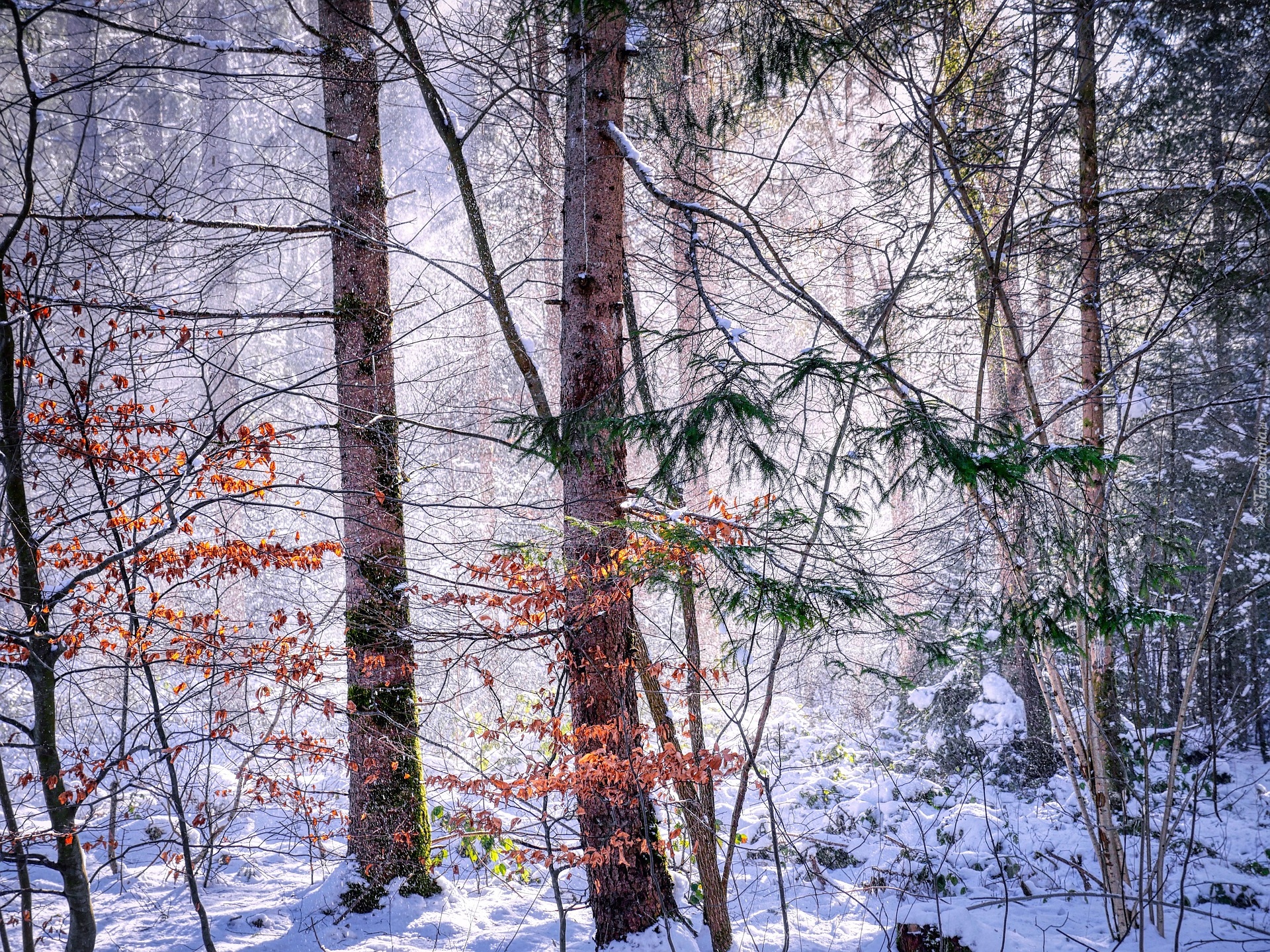 Edytor tapety: Jesienne liście na drzewach w zimowym lesie