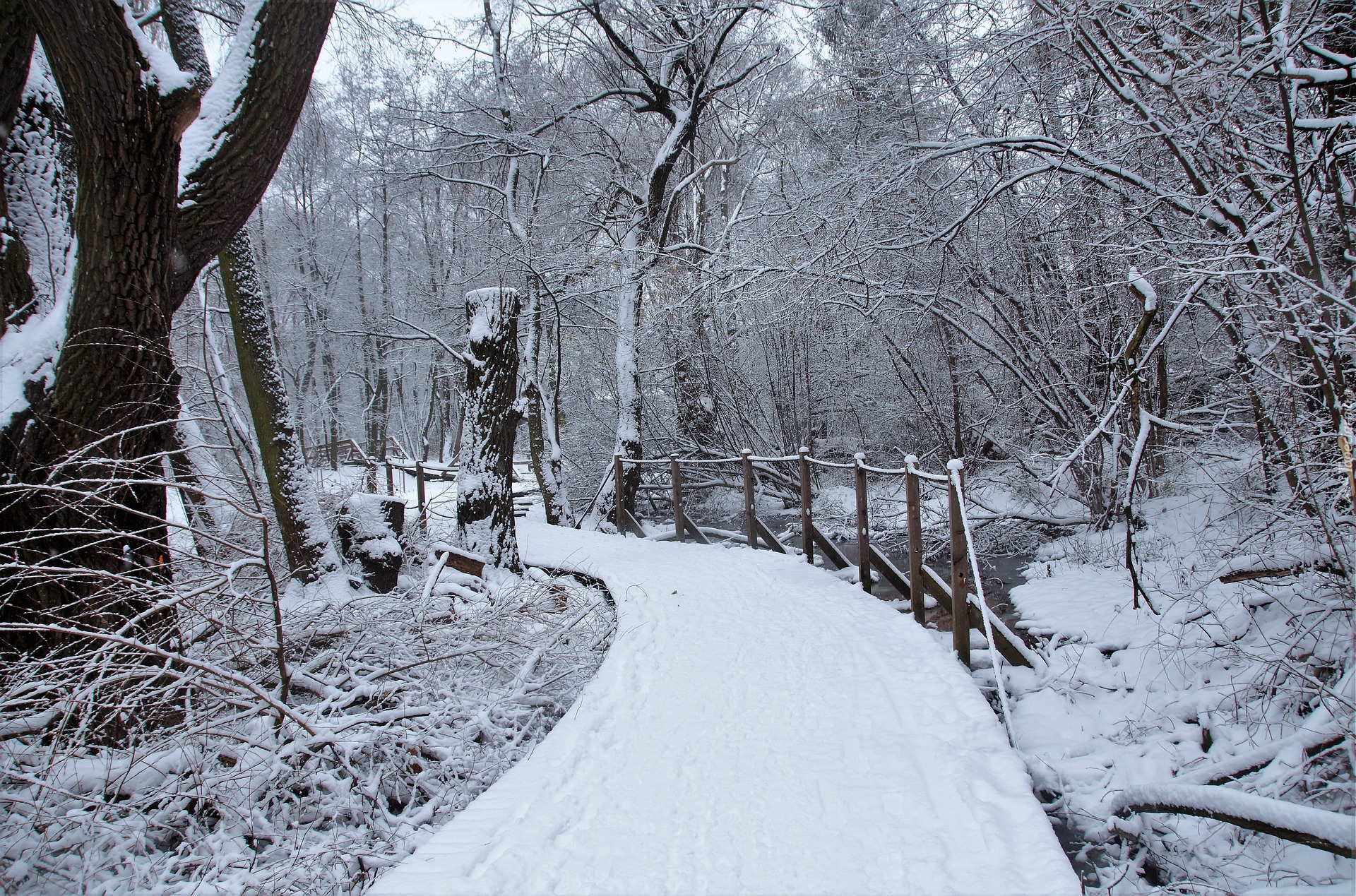 Edytor tapety: Ośnieżony most pod drzewami w lesie