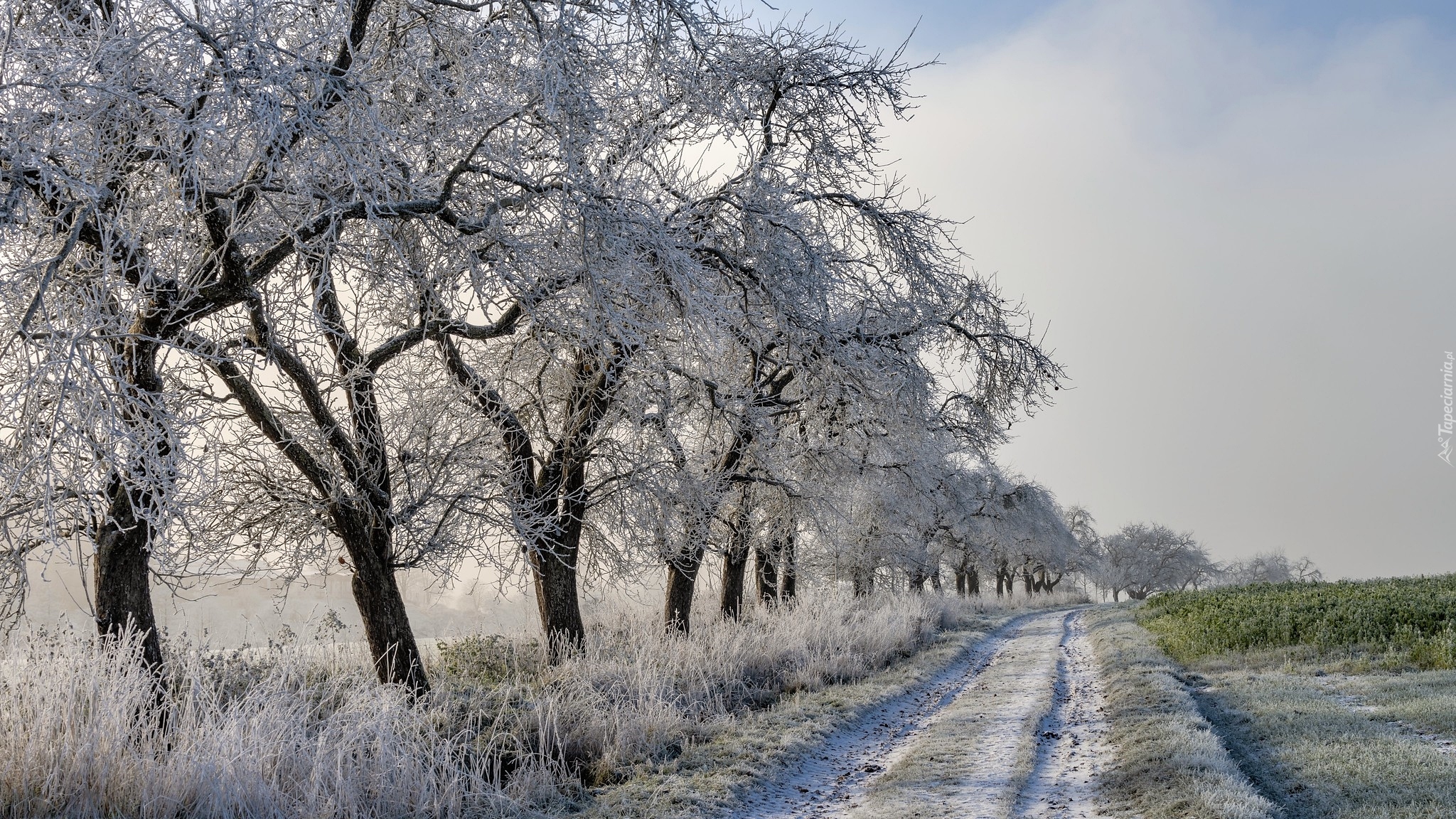 Edytor tapety: Oszronione drzewa i trawy przy drodze przez pola